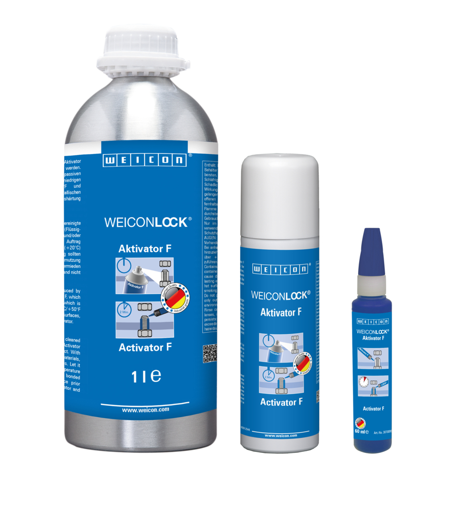 Pre-treatment with WEICON Activator F can significantly reduce the curing time. The activator is recommended for use on all passive surfaces, as well as in conditions with low ambient temperatures (+10 °C / +50 °F and below) and large bond gaps. On non-metallic surfaces, the activator is essential to enable the curing of WEICONLOCK.