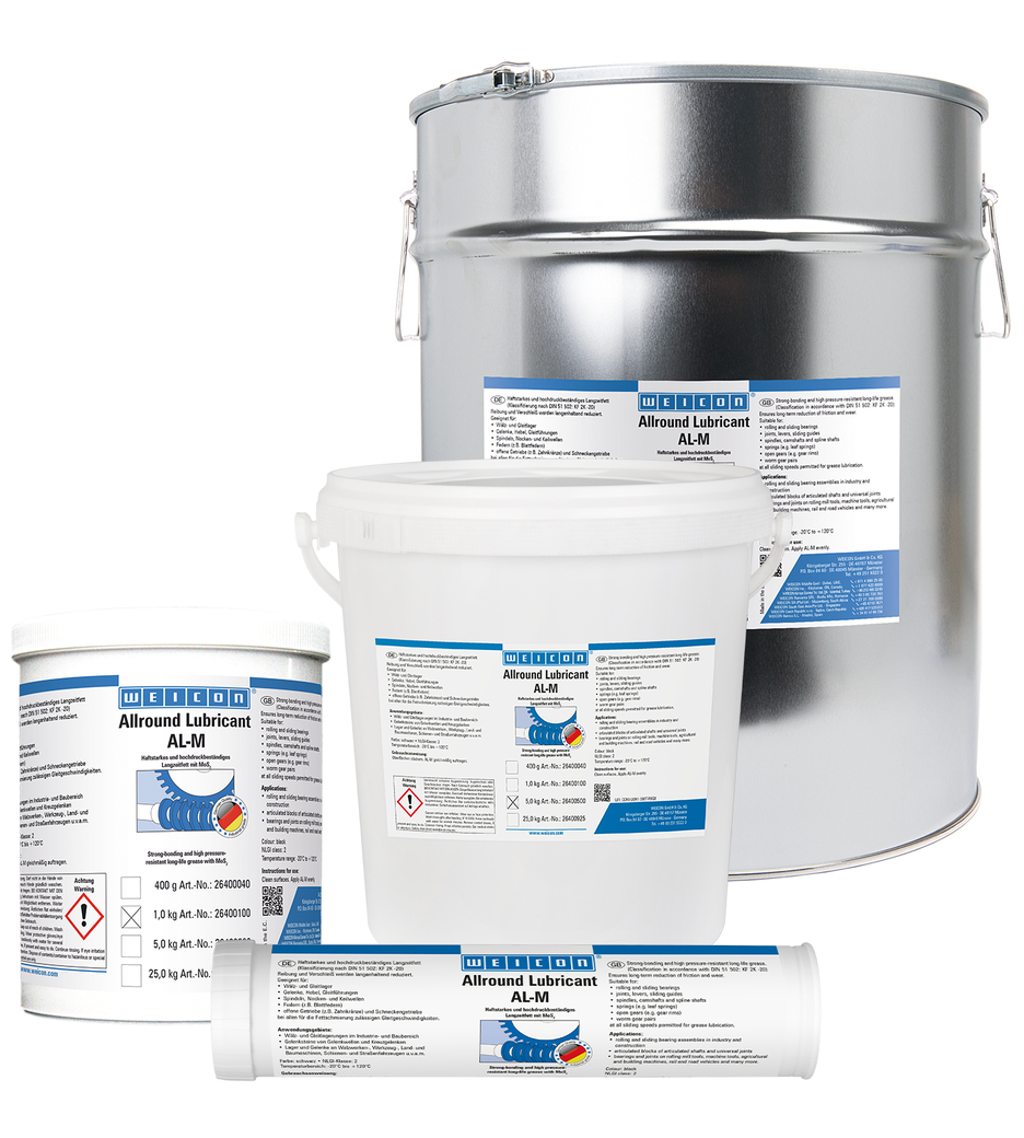 WEICON AL-M permanently reduces friction and wear and is suitable for roller and slide bearings, joints, levers, sliding guides, spindles, camshafts, spline shafts, springs, open gears and worm gears ā at all sliding speeds permitted for grease lubrication.