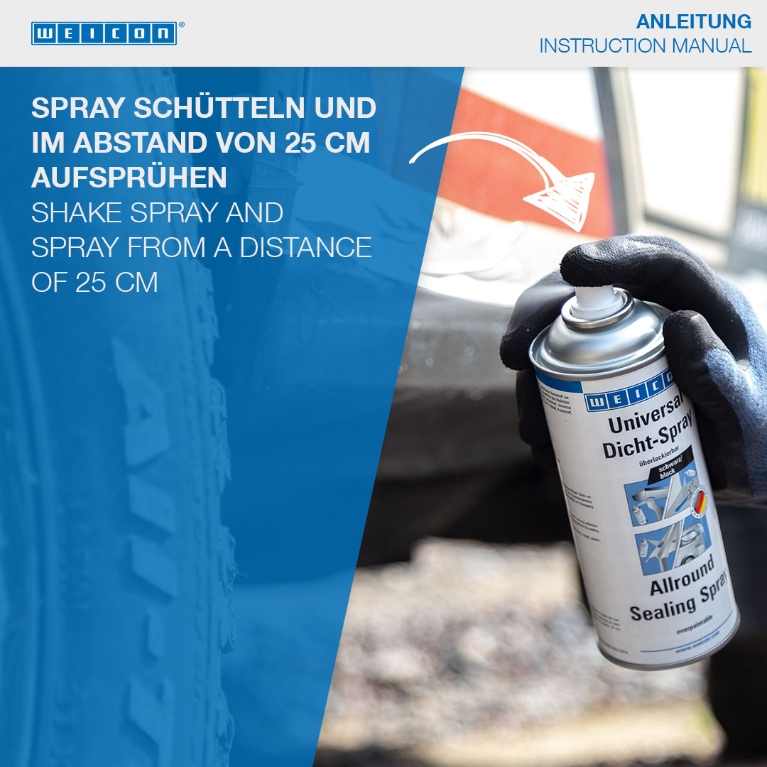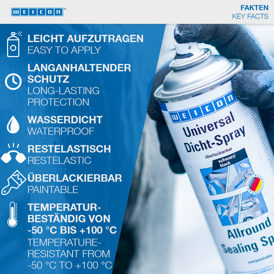 WEICON Allround Sealing Spray is a strongly adhesive, sprayable plastic for the sealing of leaks. It was developed especially for sealing thin cracks and seams indoors and outdoors. It can be used for the sealing of various components, such as gutters, sewage and drainage pipes, caravans, mobile homes, boats, roofs, windows, pool walls, pond foils, cellar shafts and ventilation shafts. Allround Sealing Spray adheres to many surfaces, like stone, metal, plastic, wood, enamel, and many more. The spray is paintable, waterproof and weather- and UV-resistant. It protects metals against corrosion and is free of bitumen and silicone.