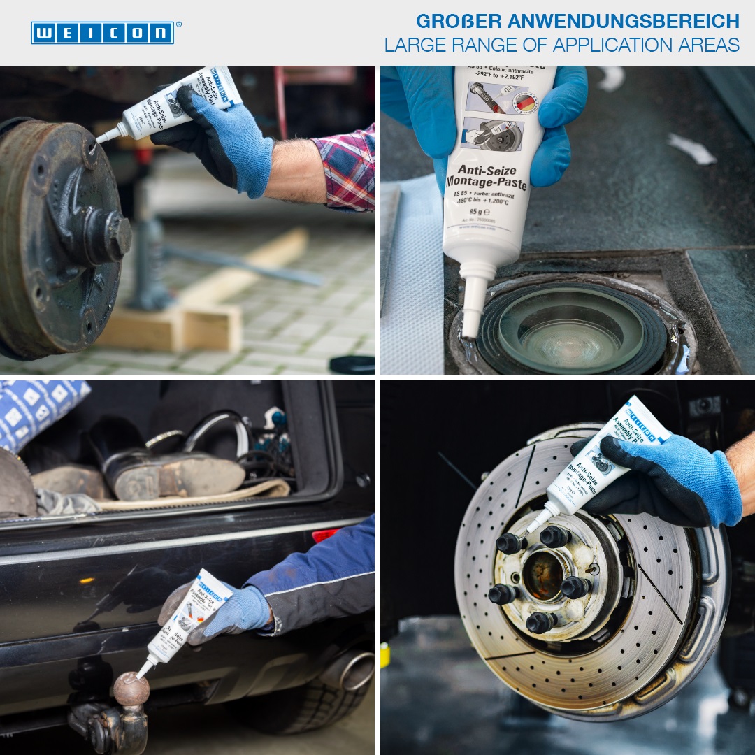 WEICON Anti-Seize is high-temperature-resistant and has excellent separating characteristics. Anti-Seize is used as a protection, realease and lubricating agent for highly stressed parts. Ideally compatible solid contents and selected additives enable a wide range of usage. WEICON Anti-Seize protects against corrosion, seizure and wear, Stick-Slip phenomena, oxidation, fretting corrosion and electrolytic reactions ("cold welding“).