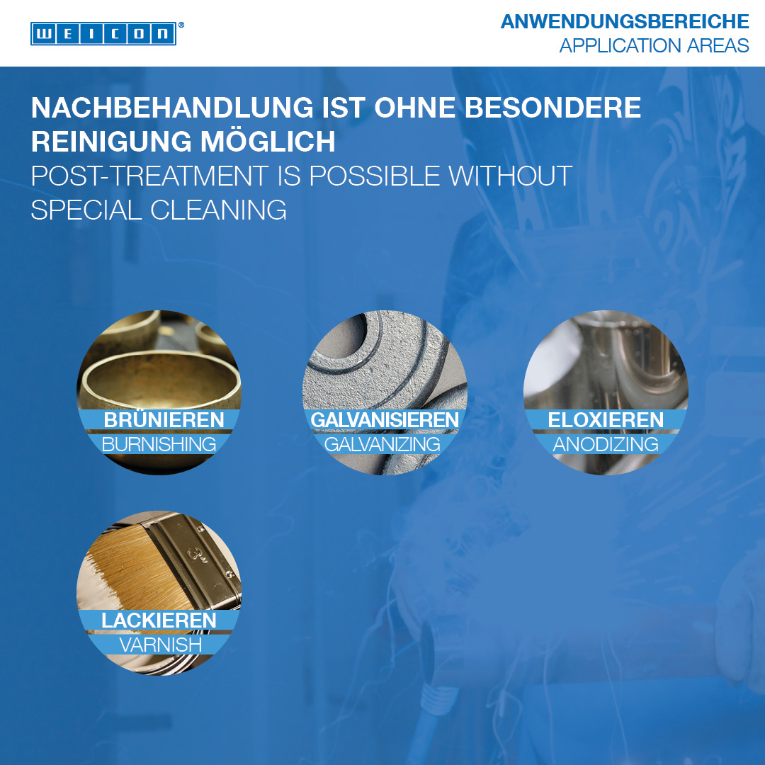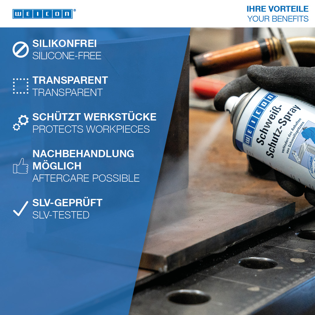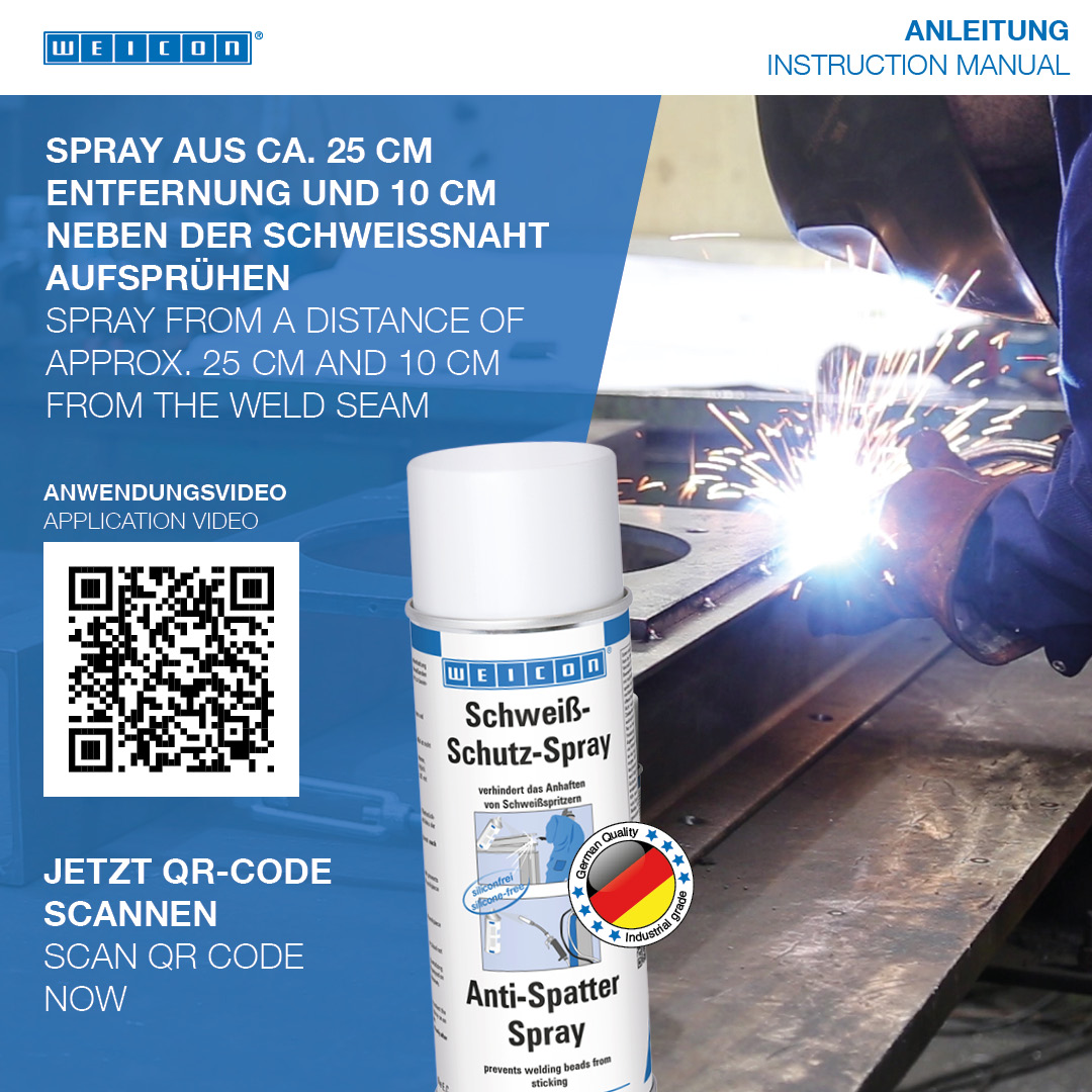 WEICON Anti-Spatter Spray prevents the adhesion of welding splashes on gas nozzles and workpiece surfaces, offers gap-free protection for the welding process, and makes follow-up cleaning of the work-pieces with a spatula, brush or chisel superfluous. The silicone-free spray is used to clean welding nozzles and to keep them clean. At the same time, it protects the work piece to be welded against the effect of weld splashes without impairing the welding seam. Post-treatment of the work-piece (such as bronzing, galvanisation, anodising or painting) is possible without special cleaning. Cleaning, e.g. with WEICON Spray Cleaner S, may be necessary solely in the case of excessive spraying.