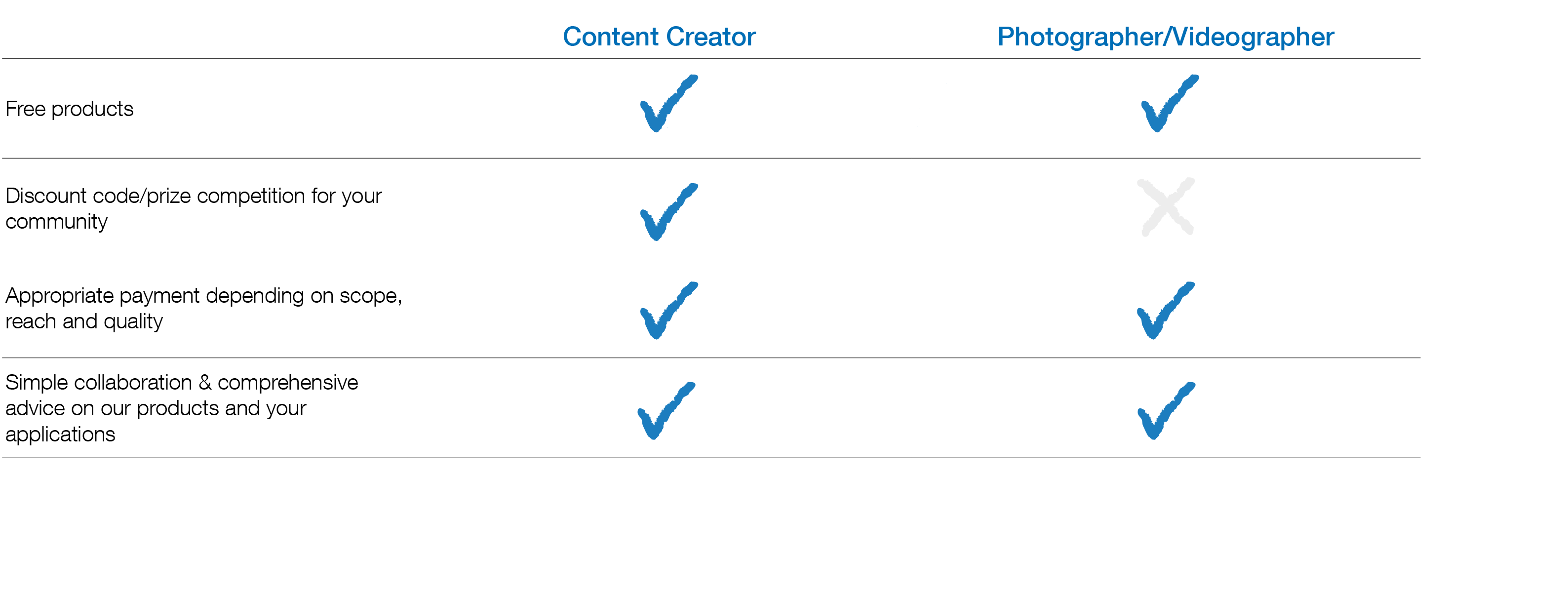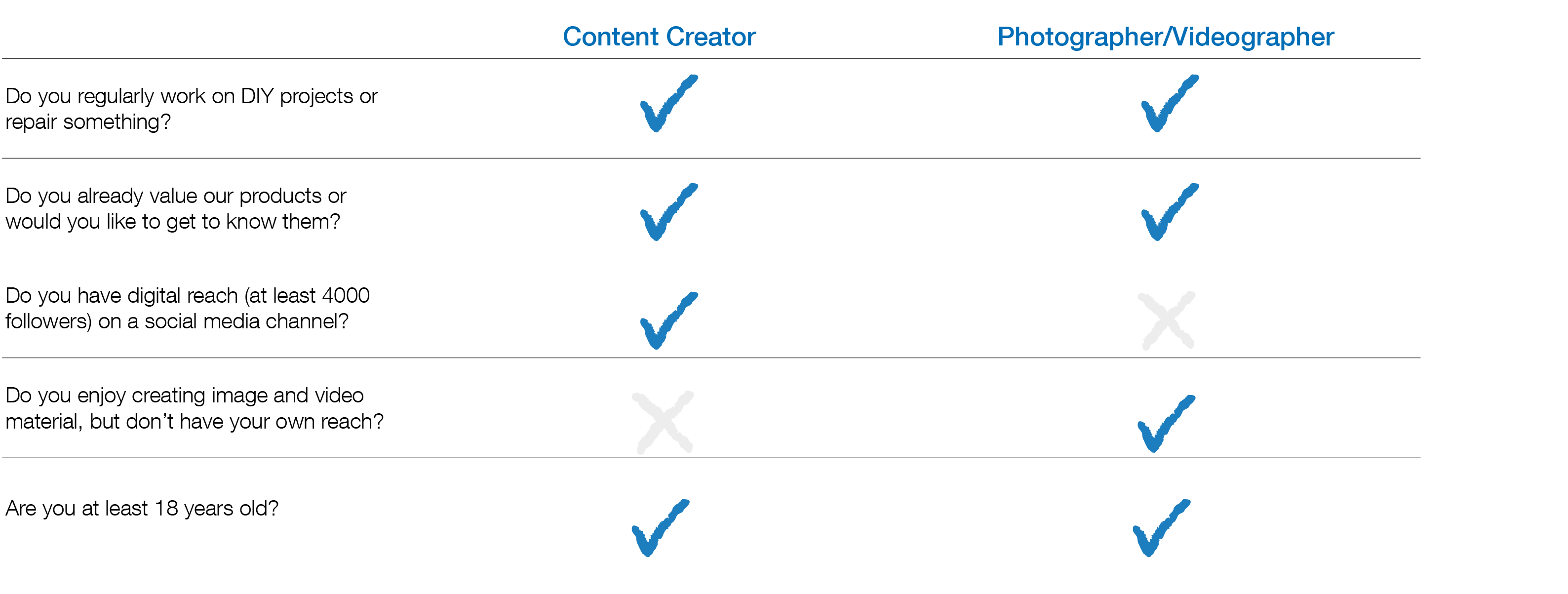 Weāre always looking for collaboration partners who use and present our products in their projects or create positive content that we can use. We definitely have a product in our range that will help you realise your project successfully, e.g. for your electrical installations, for converting your camper van or for all kinds of work in your yard or workshop. Find out whether you would be a good fit for us as a content creator or photographer/videographer. If you would like to join our creator team, simply fill out the form below and you might soon be part of our team!