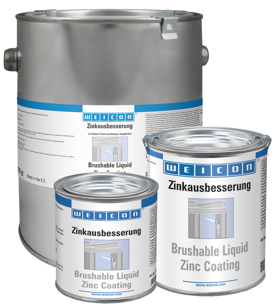WEICON Brushable Liquid Zinc Coating provides active protection against corrosion for all metallic surfaces and is available in a colour shade matching galvanization. In the case of WEICON Brushable Liquid Zinc Coating, flaky metal pigments (flakes) settle parallel to the surface in several, spatially displaced layers on the substrate (shingle effect). That way, even when the layer thickness is low, high corrosion protection is achieved. Thus, it meets the requirements stated in the DIN EN ISO 1461 standard. This protects the surface longer from penetrating moisture. Optimal corrosion protection is achieved through the simultaneous electro-chemical effect.