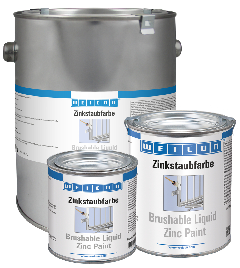 WEICON Brushable Liquid Zinc Paint is a metal pigment coating, which can be used to actively and permanently protect metallic surfaces against corrosion. WEICON Brushable Liquid Zinc Paint uses high concentration and pure spherical (round) metal pigments. The high amount of zinc in the coating ensures efficient cathodic corrosion protection. For repairs and coatings of frames, gates, doors, balustrades, poles, posts, machine parts etc. Thus, it meets the requirements stated in the DIN EN ISO 1461 standard. If the surface is damaged, the zinc molecules react with air humidity to form zinc oxide molecules which protect the base material from corrosion.
