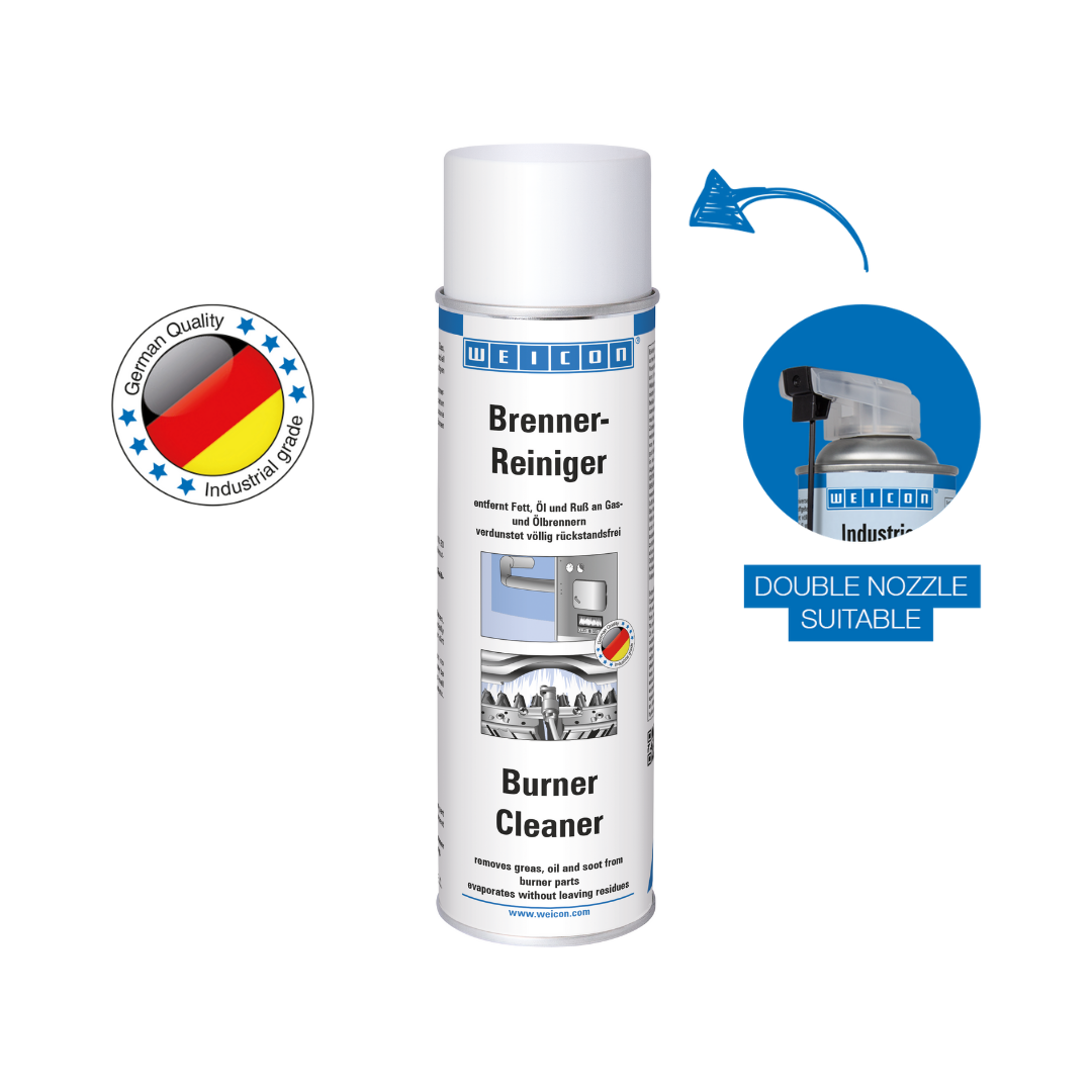 WEICON Burner Cleaner is a special cleaner for the removal of grease, oil, rust and other impurities from burner parts. WEICON Burner Cleaner evaporates without leaving residues. WEICON Burner Cleaner can be used on blast connections, baffles plates, fan wheels and in housing interiors, ignition electrodes, etc.