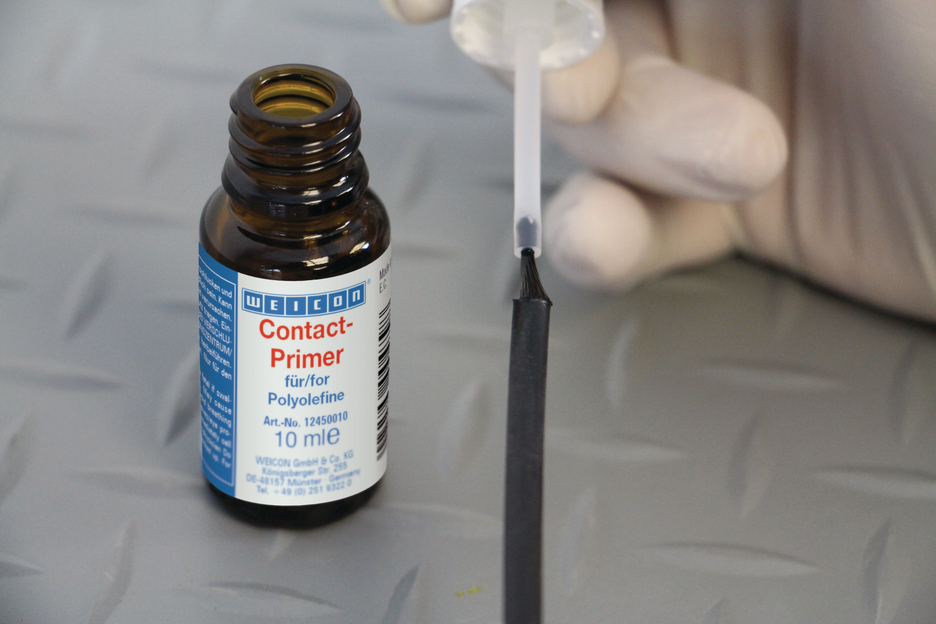 Without pre-treatment, many plastics cannot be bonded or bond only under certain conditions. When these plastics are pre-treated with WEICON Contact Primer, their surface structure changes. Thereby, the joining of materials like polyethylene (PE) and polypropylene (PP), belonging to the polyolefine group, is made possible. Even modern thermoplastic elastomers (TPE), PTFE and related plastics as well as silicones can be bonded, when pre-treated with WEICON Contact Primer.