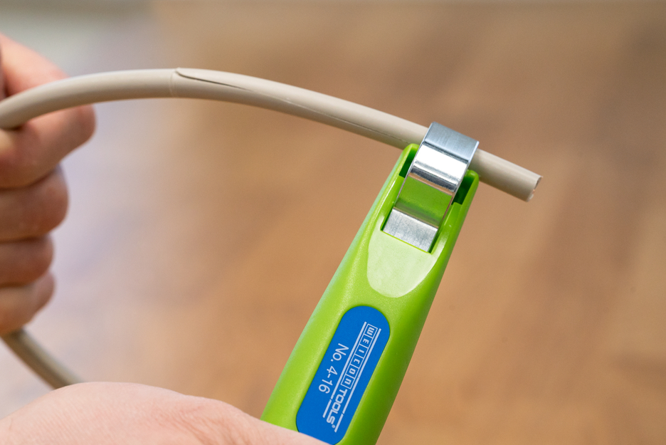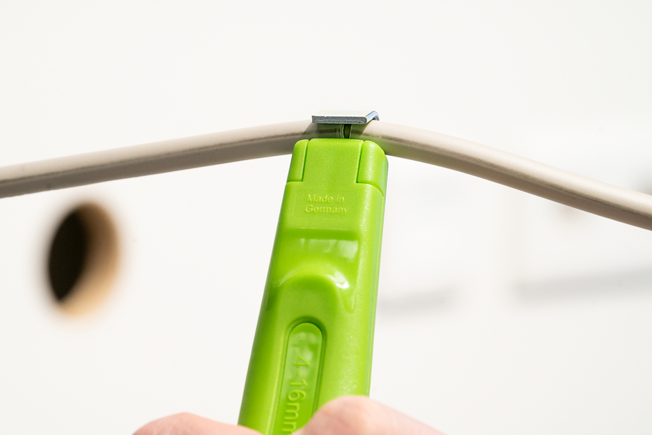 The WEICON TOOLS Green Line is a unique product range specifically designed with sustainability and resource conservation in mind. The Green Line features stripping tools made with up to 97 % renewable and natural materials The Cable Stripper 4-16 enables precise, fast and safe stripping of all common round cables with a diameter between 4 and 16 millimetres. The Cable Stripper has a non-slip, multi-component handle with ergonomic shape. Thanks to the set screw on the back of the handle, the cutting depth can be adjusted with an infinitely variable range. This prevents damaging the inner conductor. The cutting blade is integrated in the housing and self-rotating, thus enabling the automatic adjustment from circular to longitudinal cutting.