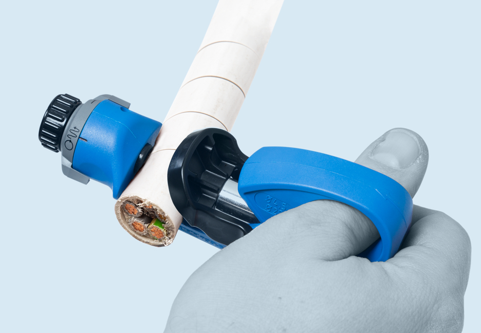 The Cable Stripper No. 4-29 is very robust, precise and suitable for soft as well as rigid insulations of cables with a diameter of 4.5 - 29 mm. The different cutting directions for round, spiral and longitudinal cutting can be safely set via the respective position of the adjustment lever. Thanks to the spiral cut, even complex insulations can be removed easier. The cutting depth can be adjusted easily and precisely. It can be set with a lockable control knob in 0.1 millimetre steps from 0 to 3 millimetres. That way, the layers below are not damaged. The handy and ergonomic tool features a locking system. This function prevents the tool from opening in the longitudinal cut setting. Therefore, breaking of the hardened steel blade due to incorrect handling is prevented. The special sliding properties of the contact surface guarantee resistance-free working on the cable. A special grind of the replaceable blade ensures the clean removal of the outer sheath.