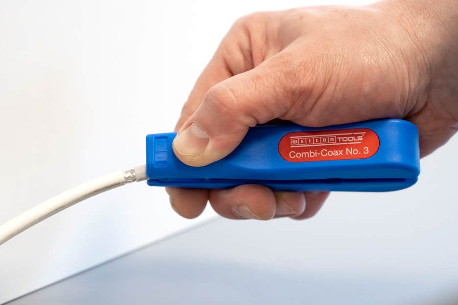 The Combi-Coax No. 3 enables step-by-step stripping of all common coaxial cables, NYM cables and flexible cables. Adjusting the cutting depth manually is not necessary. The Combi-Coax No. 3 strips coaxial cables with a diameter of 4.8 - 7.5 mm, NYM cables of 3 x 0.75 mm² and flexible cables of 10 and 16 mm². In addition, the Combi-Coax No. 3 has an easily accessible side cutter for cables up to 8 mm in diameter. When using the stripper, a precise cutting pattern is shown during stripping. For example, the first sheath of a coaxial cable can be removed with the knife of the stripper on side A. Then the inner conductor is stripped with side B.