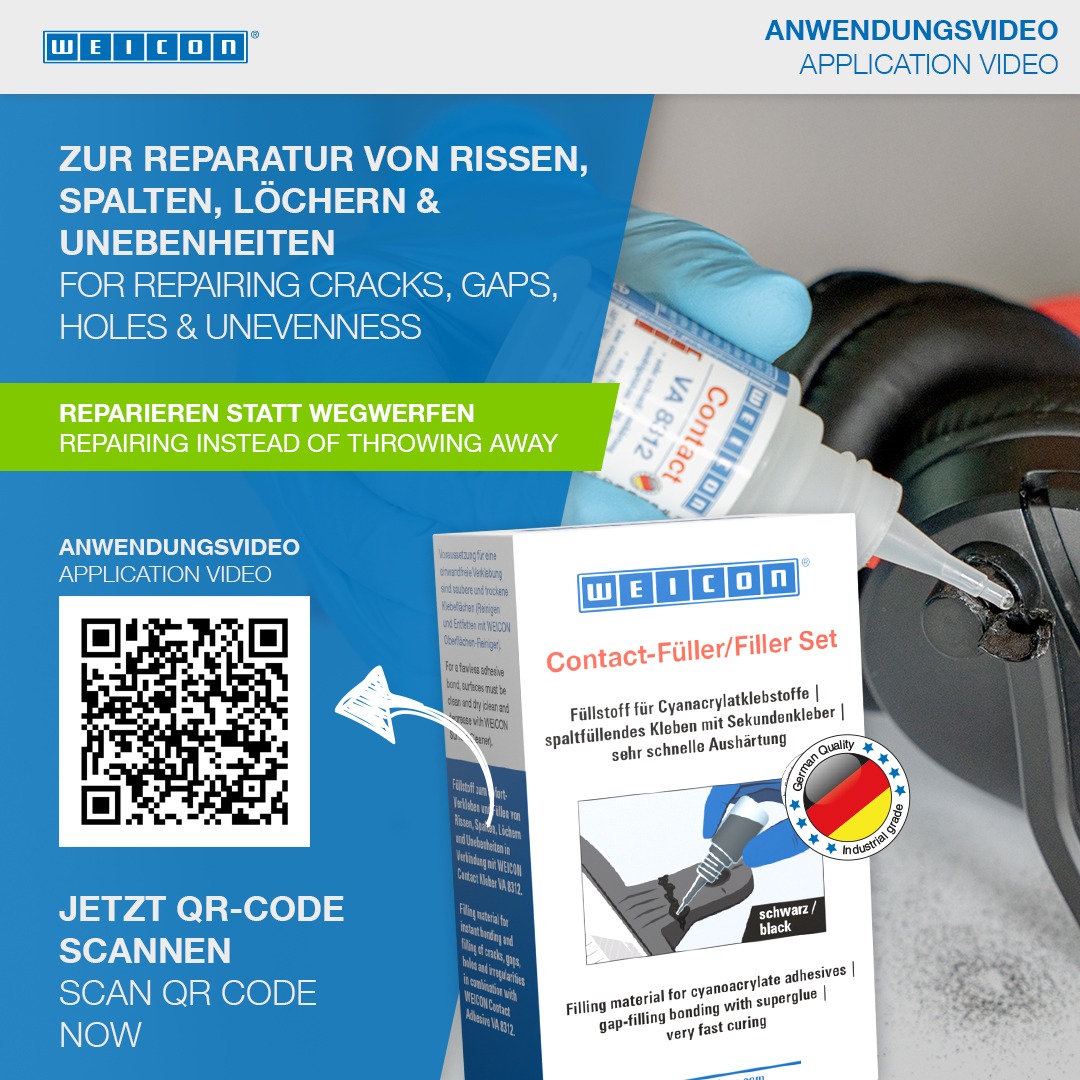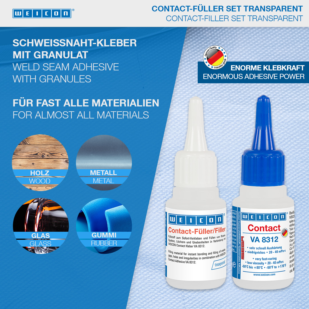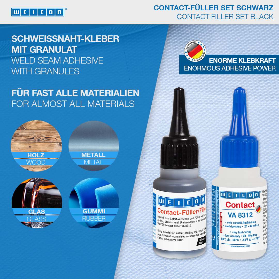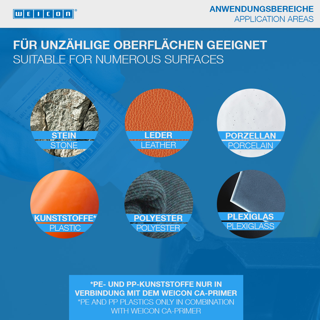 WEICON Contact VA 8312 is suitable for the bonding of various rubber materials, such as solid rubber or cellular rubber, plastics and EDPM elastomers. In combination with WEICON CA-Primer, VA 8312 can also be used for polyolefines (PE-polyethylene, PP-polypropylene). In combination with WEICON Contact Filler, VA 8312 is suited for the instant bonding and filling of cracks, clefts, holes and uneven surfaces.