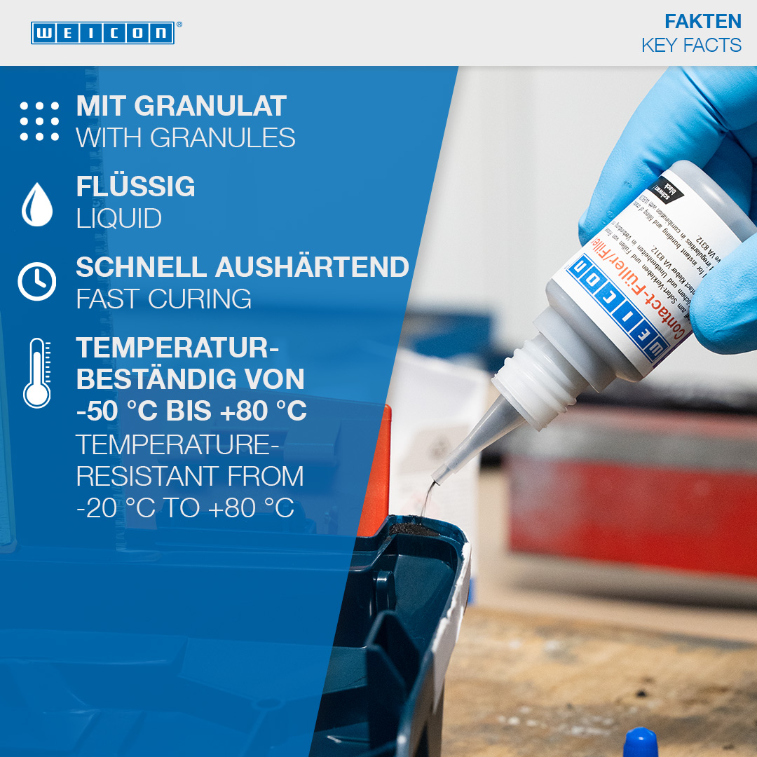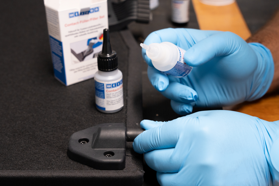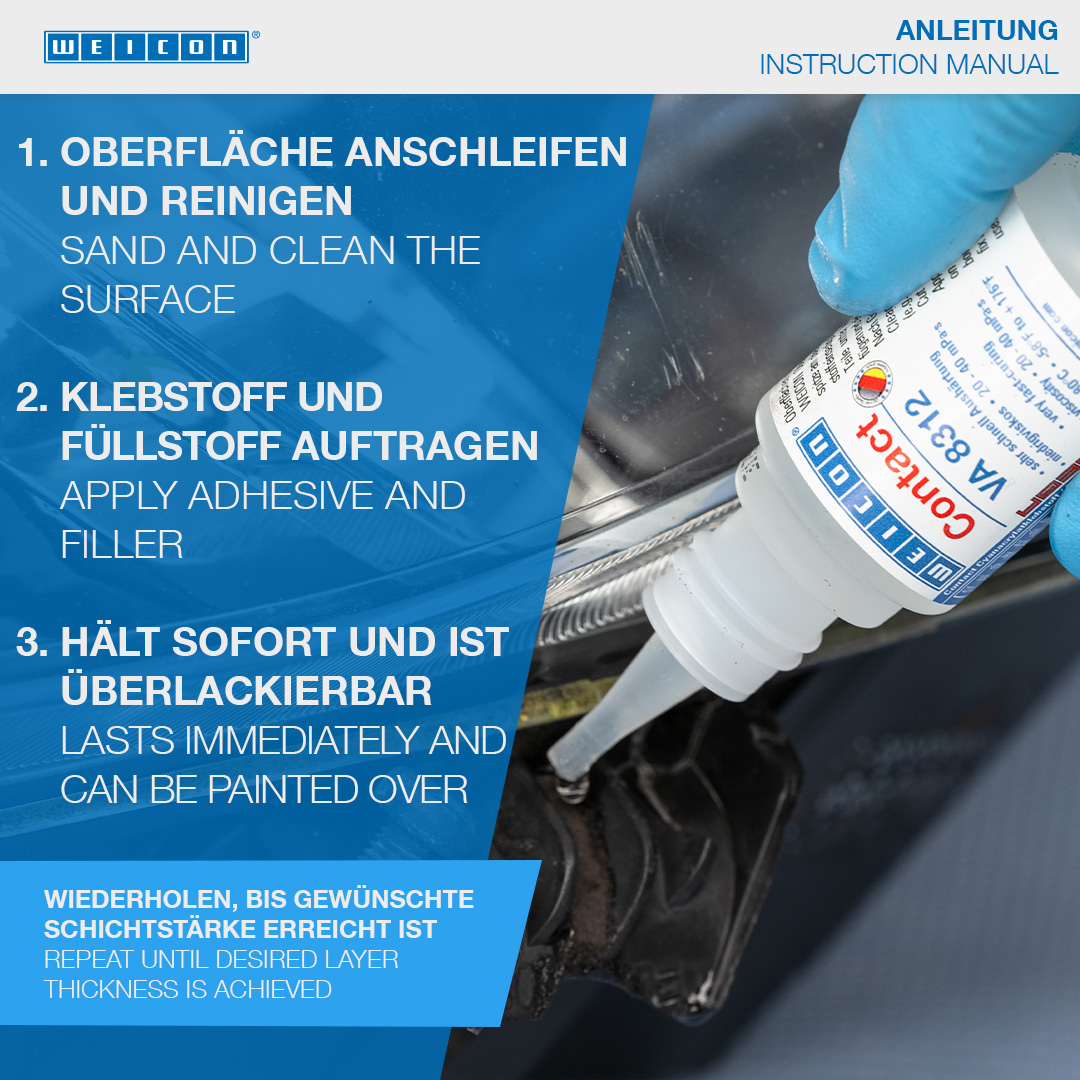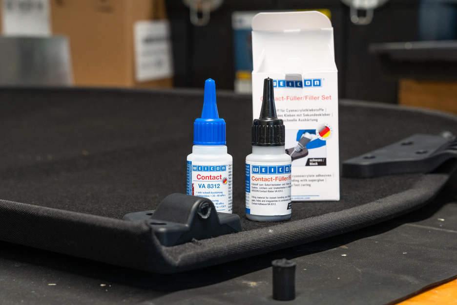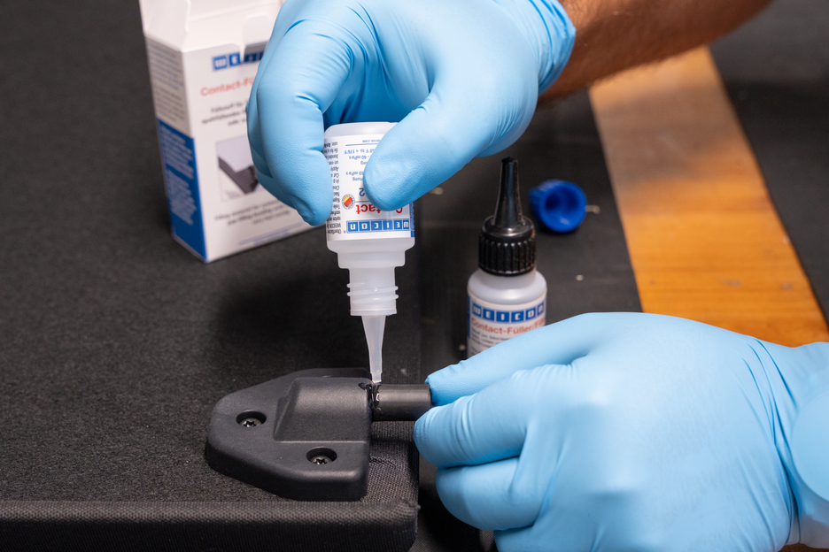 WEICON Contact VA 8312 is suitable for the bonding of various rubber materials, such as solid rubber or cellular rubber, plastics and EDPM elastomers. In combination with WEICON CA-Primer, VA 8312 can also be used for polyolefines (PE-polyethylene, PP-polypropylene). In combination with WEICON Contact Filler, VA 8312 is suited for the instant bonding and filling of cracks, clefts, holes and uneven surfaces.