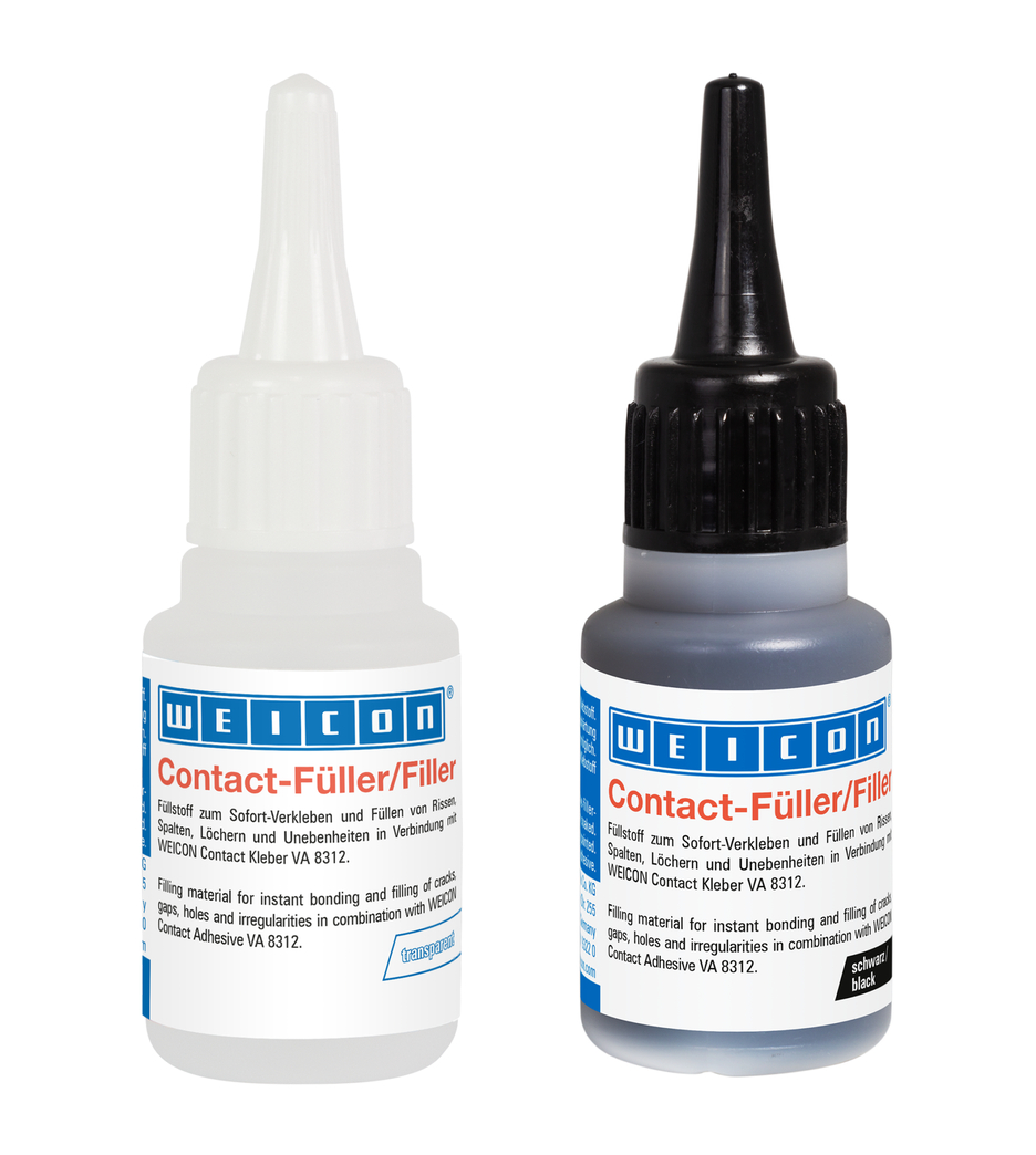 Silica-based filler specially developed for WEICON cyanoacrylate adhesives for covering larger adhesive gaps of more than 0.1 mm as well as for filling cracks, gaps, holes and unevenness. Contact filler is therefore suitable in combination with Contact cyanoacrylate adhesive not only for bonding, but also for reinforcing, shaping, modelling, fixing, filling as well as evening out and levelling.