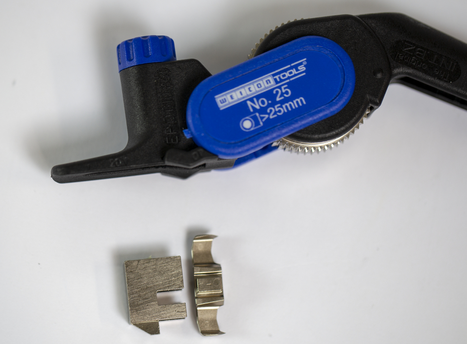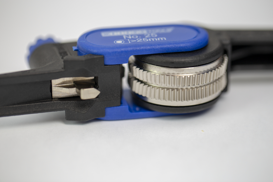 The Dismantling Tool No. 25 is designed for stripping cables up to a sheath thickness of 5 mm. The knife can be used for both longitudinal and circular cutting. Circular cutting can be carried out on cables with an outer diameter of 25 mm or more. Cutting of the outer insulation is done by small lever movements and simultaneous pressing of the serration against the insulation. The tool consists of an impact-resistant polyamide body with an inserted, double-edged blade and a gear wheel connected to it. It safely enables longitudinal and circular cuts to be made on the cable outer sheath, irrespective of whether the work is carried out on the cable end or on intermediate pieces. The cutting depth can be adjusted in steps from 0 to 5 mm by simply turning the adjusting head (via detents of 0.1 mm). The shape of the blade allows stripping of the outer sheath, including any aluminium shields, up to a sheath thickness of 5 mm without damaging the underlying layers. The operation can be carried out without problems even at very low temperatures (-10°C). The blade of the tool has a hardness of min. 48 HRC and is easily replaceable.