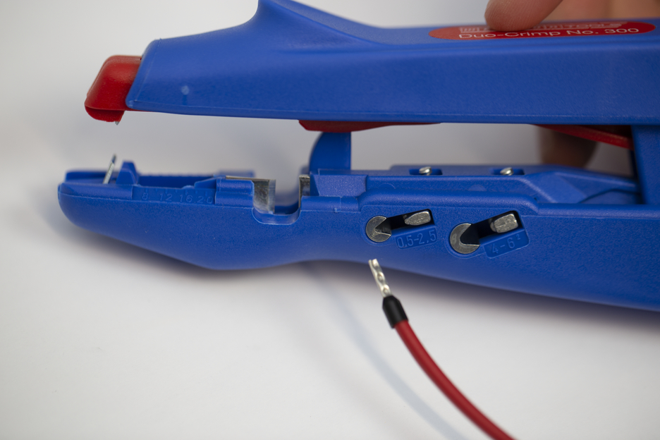 With the WEICON Duo-Crimp No. 300 can be used to strip conductors and crimp wire end ferrules. With the automatic scanning system no adjustment to the cable cross-section is necessary. The stripper has an optical length scale of 8 - 20 mm and is suitable for all common stranded and solid conductors from 0.5 mm² - 6.0 mm². The Duo-Crimp No. 300 insulates conductors to a length of 5 mm, preventing the individual conductors from splicing. Two crimping ranges are offered: 0.5 - 2.5 mm² and 4.0 - 6.0 mm². A well-accessible side cutter is integrated in the tool, which is suitable for cable cross-sectors up to 6 mm² (solid conductors up to 4 mm²).
