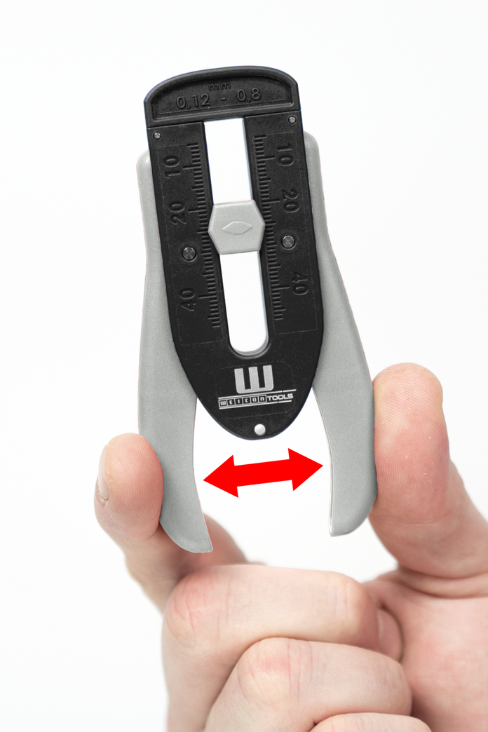 Semi-automatic wire stripper for the fast and safe stripping of extremely thin conductors, strands or wires with small diameters in the range of 0.12 mm - 0.8 mm (36 - 20 AWG). The tool was tested by an ESD laboratory and complies with the DIN EN 61340-5-1 standard. The wire stripper is suitable for working in electrostatic protected areas (ESD workspace/ ESD-protected area). With the adjustable scaled length stop for the working range from 5 to 45 millimetres, the desired stripping length can be set quickly and reliably. Two durable, precisely adjusted torsion springs, which push symmetrically onto the pair of blades with a defined force and automatically cut the respective insulation with the appropriate pressure, ensure comfortable working. In combination with the scanning system that is integrated in the tool, this ensures damage-free stripping. The tool is suitable for both right- and left-handed users.