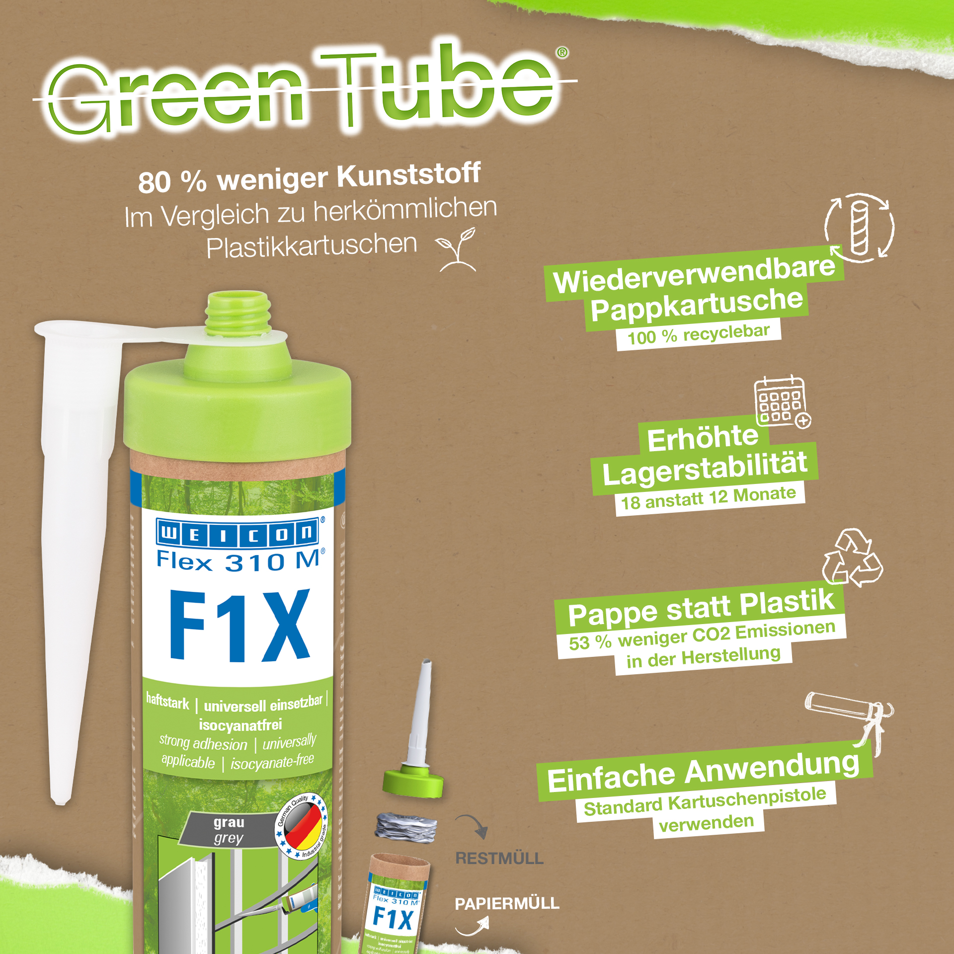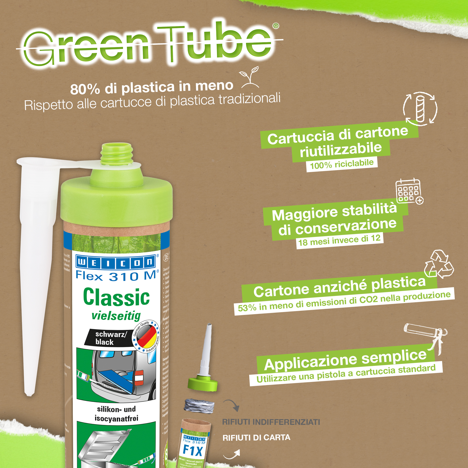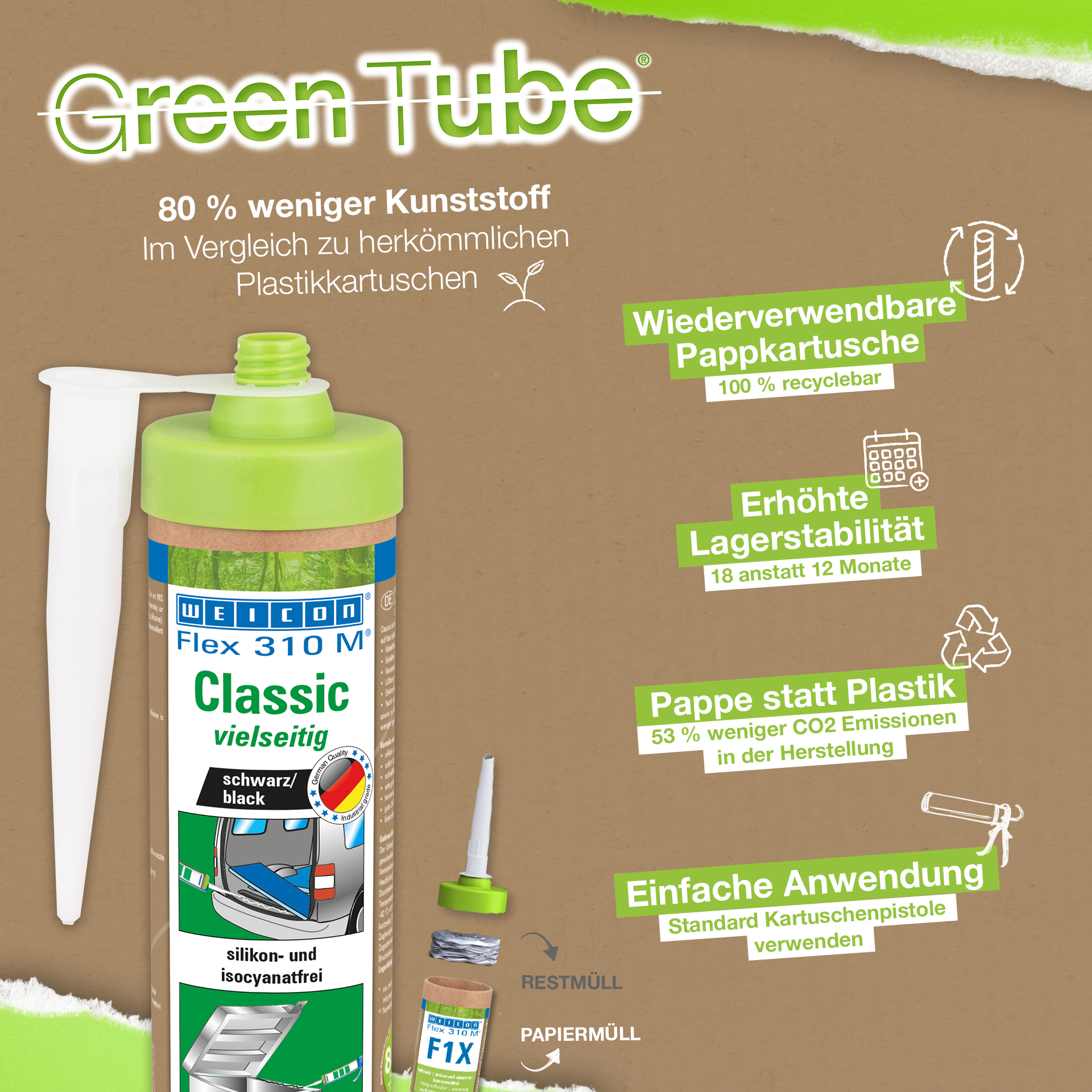 WEICON Flex 310 M Classic is strong, paintable (wet-on-wet), sandable, has an outstanding resistance to ageing and good resistance to UV rays. It is resistant to fresh and salt water and is free of silicone, isocyanate, halogens and solvents. The product as an ISEGA certificate and can be used as an adhesive in the food technology. Flex 310 M Classic is an elastic adhesive based on MS polymer and is suitable for the bonding of metals, many plastics, ceramics, wood, glass and stone. This adhesive and sealant can be used in metal construction, tank and apparatus engineering, carriage, vehicle and container construction, ventilation and air conditioning systems, in the electrical industry, yacht and boat construction, and in all applications where silicones or products containing silicones are not suitable.