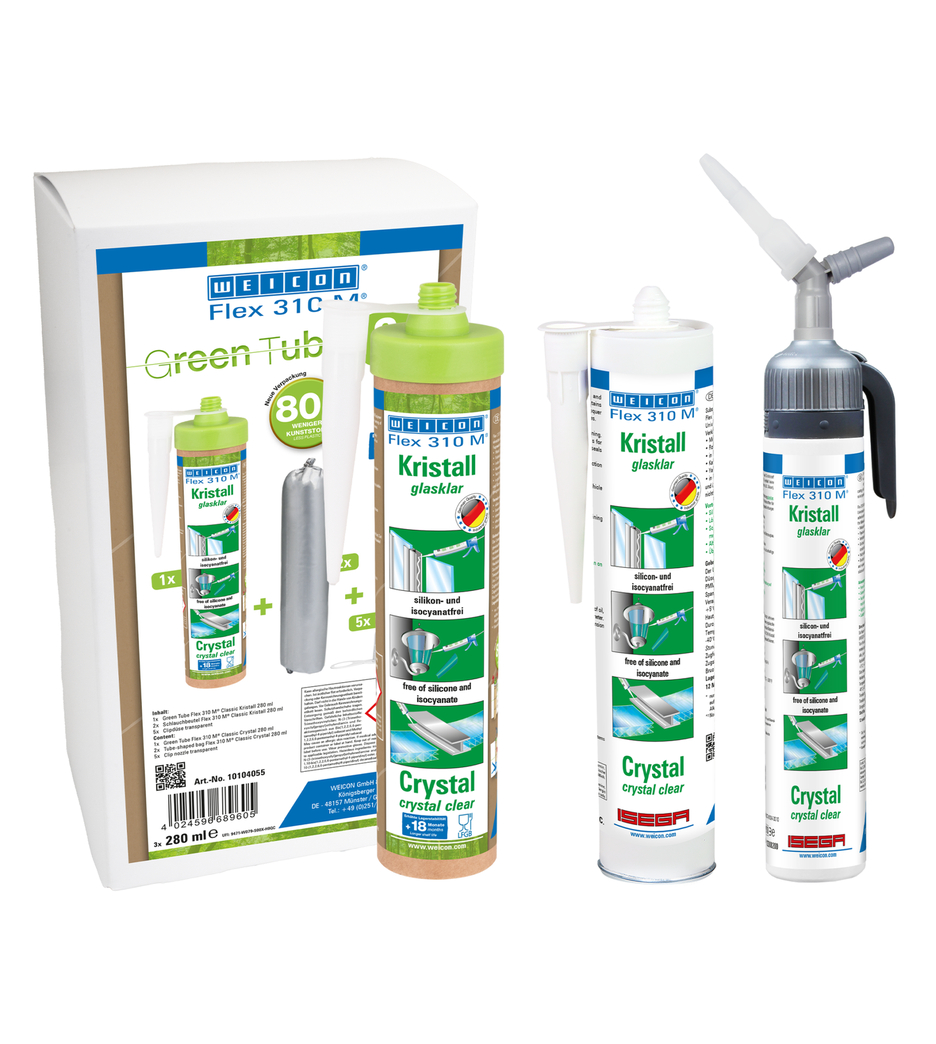 WEICON Flex 310 M Crystal is transparent, strong, paintable (wet-on-wet), sandable, has an outstanding resistance to ageing and good resistance to UV rays. It contains no silicone, isocyanate, halogens or solvents. It has an ISEGA certificate and can be used as an adhesive in the food technology. Flex 310 M Crystal is an elastic adhesive suitable for bonding glass, PC* and acrylic glass*, metals, many plastics, ceramics, wood and stone. The product is crystal clear after curing and is particularly suited for elastic joints where the adhesive should or must not be visible. It can be used in plastic processing, metal construction, tank and apparatus engineering, in ventilation and air conditioning systems, the electrical and lighting industry, in exhibition stand construction and shopfitting, and in all applications where silicones or products containing silicones are not suitable. (* = only for tension-free bonding)