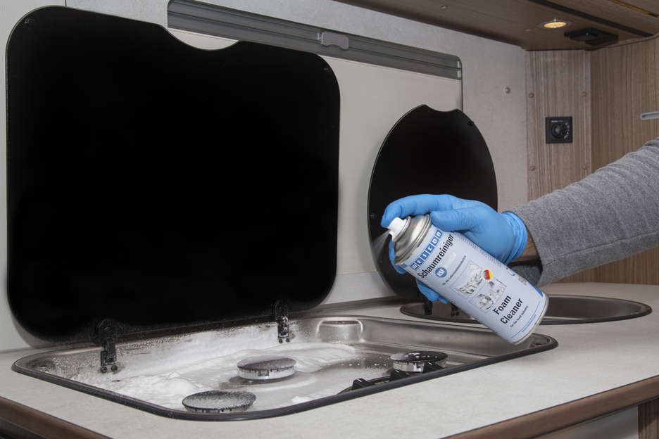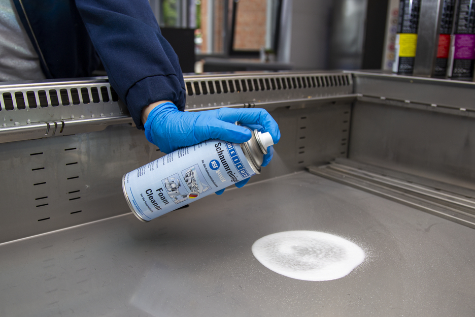 WEICON Foam Cleaner is universally applicable and can be used for the cleaning and degreasing of water-resistant surfaces and for the removal of soilings on plastic, glass and textile surfaces. Due to its NSF A1 registration, the foam cleaner is suitable for use in sensitive areas, such as the food and beverage industry as well as in the pharmaceutical and cosmetics industry. The spray is suitable for the cleaning of conveyor belts with contact to food, for example in production lines or retail shops. It removes soilings on machine housings and cleans scales, flat screens, touch screens, navigation systems and many more. Foam Cleaner eliminates many different impurities, such as oils and greases, fingerprints, soot, nicotine, dust as well as residues of insects. It can be used wherever acidic or alkaline detergents are not allowed.