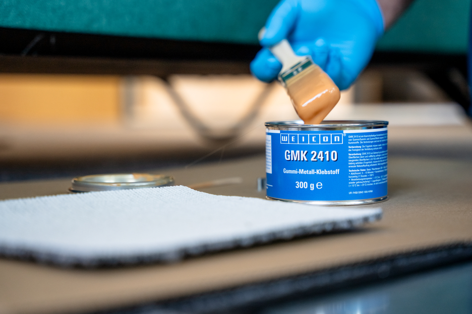 WEICON GMK 2410 is an adhesive based on polychloroprene (CR) for the high-strength, full-surface and flexible bonding of: - rubber to rubber - rubber to metal GMK 2410 also bonds cellular rubber, PE foam, leather, felt, insulating material, textiles, wood, and many plastics. WEICON GMK 2410 is not suitable for materials such as expanded polystyrene, polyethylene, polypropylene, flexible PVC foam, and artificial PVC leather.
