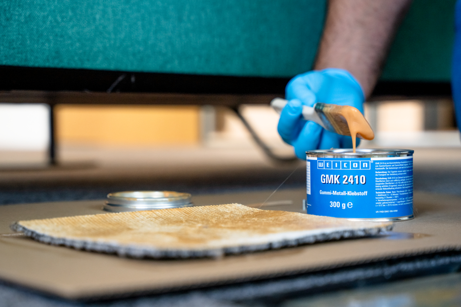 WEICON GMK 2410 is an adhesive based on polychloroprene (CR) for the high-strength, full-surface and flexible bonding of: - rubber to rubber - rubber to metal GMK 2410 also bonds cellular rubber, PE foam, leather, felt, insulating material, textiles, wood, and many plastics. WEICON GMK 2410 is not suitable for materials such as expanded polystyrene, polyethylene, polypropylene, flexible PVC foam, and artificial PVC leather.