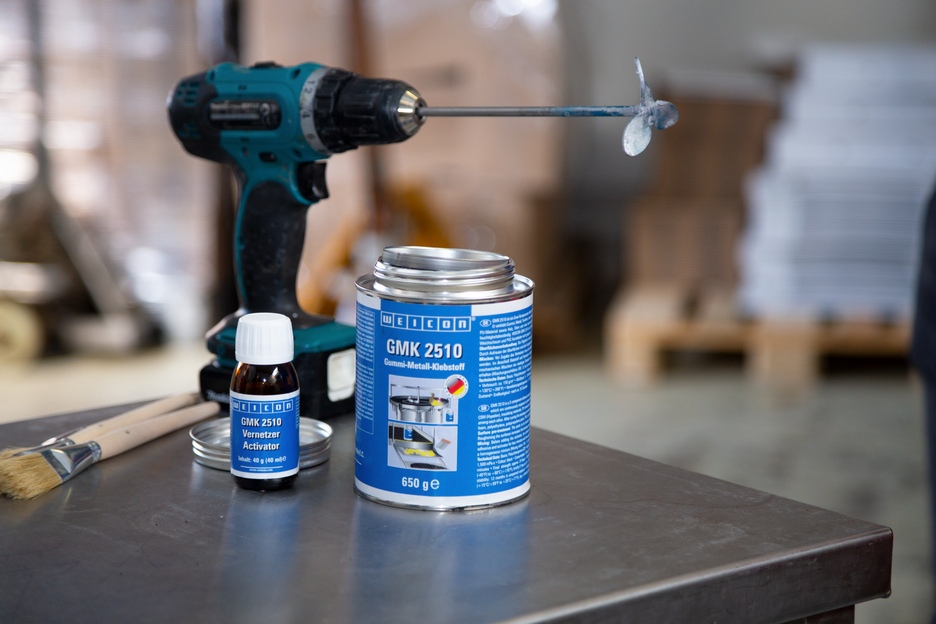 GMK 2510 is a 2-component adhesive based on polychloroprene for the full-surface and permanently elastic bonding of parts continuously exposed to dynamic loads. The advantage compared to 1-component contact adhesives is the significantly improved adhesion and higher temperature resistance. GMK 2510 bonds rubber, metal, textiles, leather, sponge rubber (neoprene), CSM (Hypalon), insulating materials, PU materials with an adhesive coating, wood, stones and many plastics. After curing, the joint is resistant to humidity. WEICON GMK 2510 is not suitable for materials such as polystyrene foam, polyethylene, polypropylene parts, PVC soft foam and PVC imitation leather.