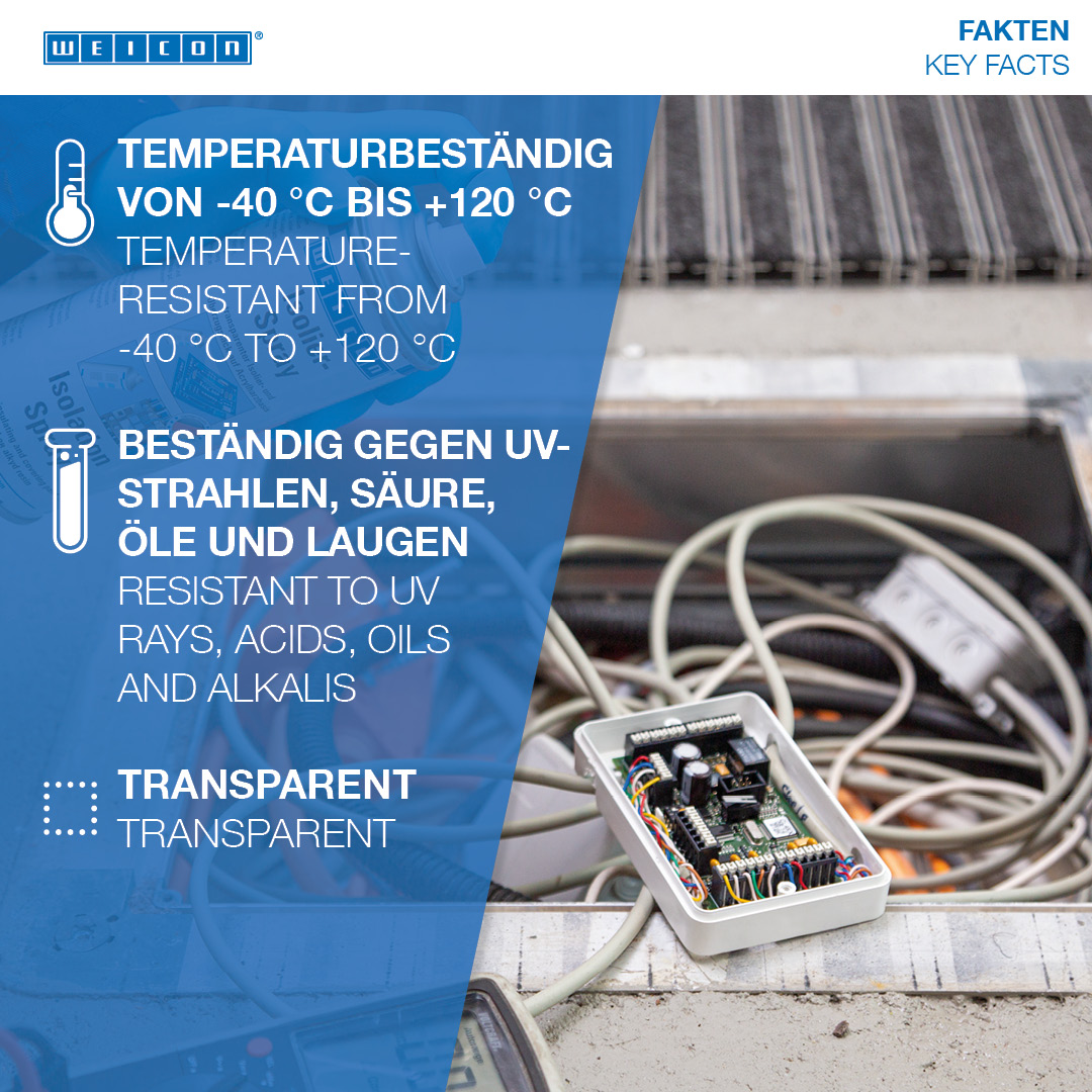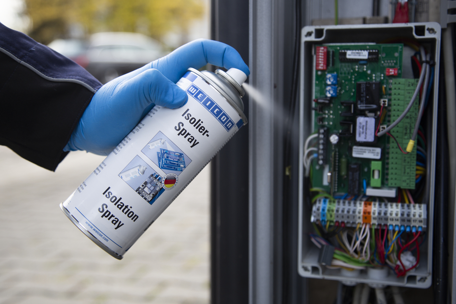 WEICON Isolation Spray is a transparent insulating and finishing varnish based on acrylic resin. It forms a flexible and resistant layer, which shows excellent adhesion to metal, glass, plastic or wood. It is resistant to UV radiation, acids, oils and lyes. It is moisture- and weather-resistant and stands out particularly due to its high dielectric strength. The spray protects against moisture as well as different vapours. It can be used as protective coating for circuit boards, on electrical connections, switches, switchboards, electronic components and coils, as universal sealant in electrical engineering or for the repair of insulations on electric motors, windings and frames.