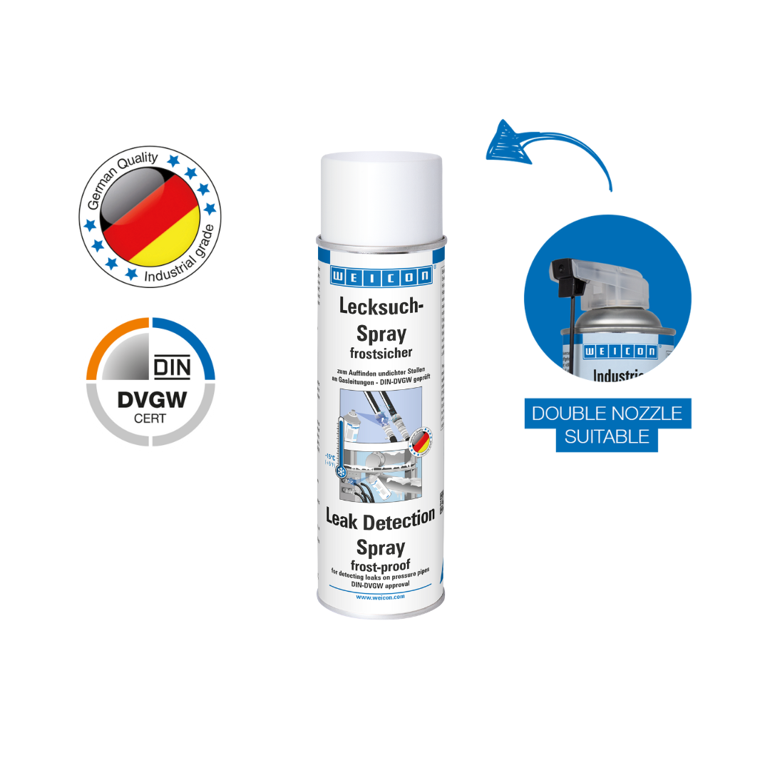 The safe, easy and quick way to find leaks or porous spots on gas pipes, cooling and air conditioning systems. Leak Detection Spray frost-proof does not form any harmful compounds with these gases: carbon dioxide (CO2), propane, butane, acethylene, oxygen, coal and natural gas, nitrogen, dinitrogen monoxide (N2O) and CFC. It is non-flammable. Leak Detection Spray frost-proof is suitable wherever compressed air or gaseous substances are used. The spray can be used, for example, on pipes, hoses, fittings, soldered, screw and welded connections, fittings, valves connectors and adapters.