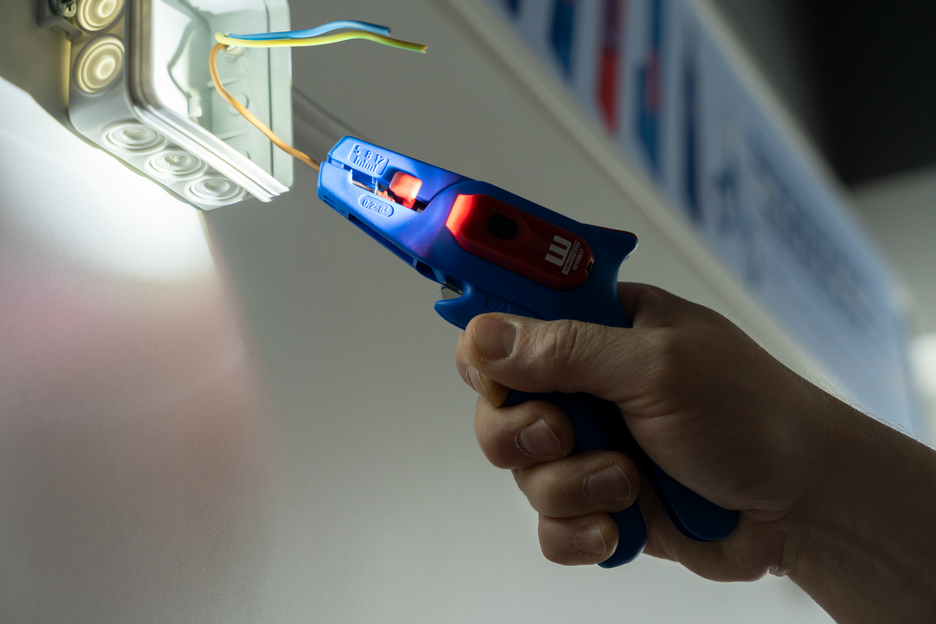 Electricians should always work with the power turned off when handling electrical installations, wires or devices. During work, e.g. in a construction site, there is often insufficient lighting or illumination. This new work light offers a perfect solution. The work light is very easy to attach to the stripping tool. To attach it, simply remove the printed plastic plate on one side of the stripper and press the light with its two mounting points into the designated holes. This ensures that the work light always remains in the correct position and cannot fall or slip. The lamp is switched on by pressing the switch. Press several times to select the brightness level (three levels with 50, 127 or 250 lumens). To switch off the lamp, press and hold the on/off switch. The LED Work Light has a length of 48 mm and a weight of 15 g. The LED light has IP65 certification and is both dustproof and splash-resistant. The Work Light has a 180 mAh lithium battery and can be used for approx. 2 hours on a medium setting after a charging time of 40 minutes. The service life of the battery charge varies depending on the selected light intensity. The WEICON TOOLS LED Work Light is available in the colours red and black.