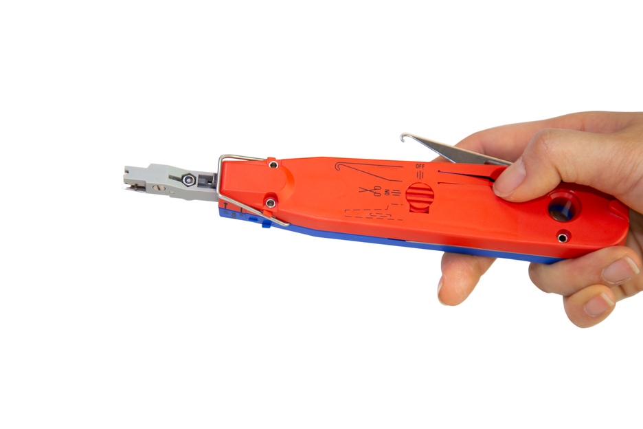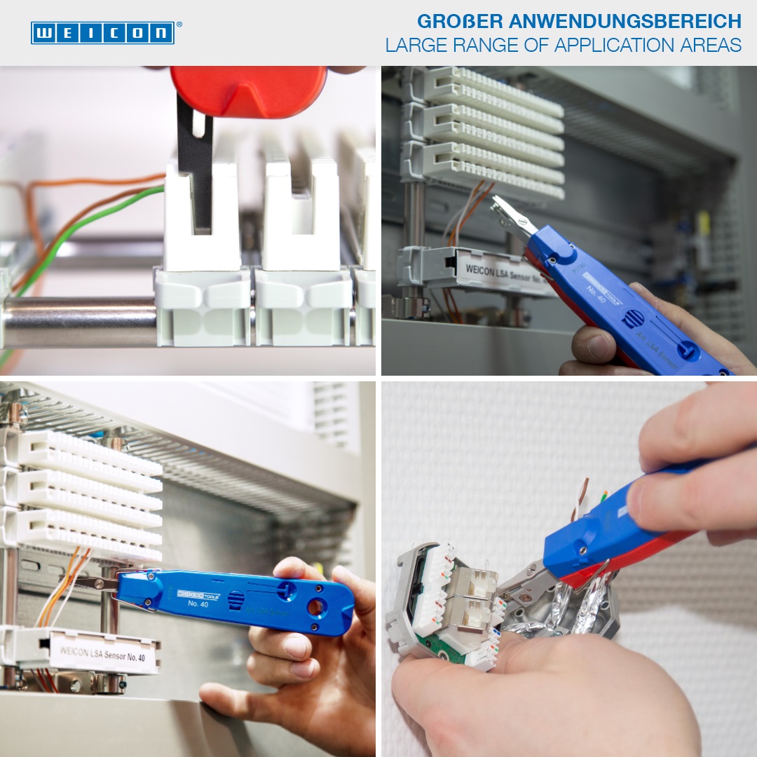With the Sensor No. 40, wires with a conductor diameter of 0.35 - 0.9 mm and a wire diameter of 0.7 - 2.6 mm can be wired into LSA panels or blocks. With a gentle push on the tool, the wires are inserted and cut off in just one single step. Manual stripping or screwing is not required. The integrated scissors can be switched off if necessary, for example when cutting off the wire ends is not desired. The sensor ensures that the scissors are only activated when the wire is punched into the contact sufficiently deep. For double wiring of contacts, the sensor can be deactivated (OFF). Moreover, the LSA Sensor No. 40 has a built-in, retractable hook for removing wires from the LSA contact as well as a retractable unlocking blade for loosening LSA modules from the mounting bracket. The tool is tested for up to 200,000 wirings (with 0.4 mm wire diameter).