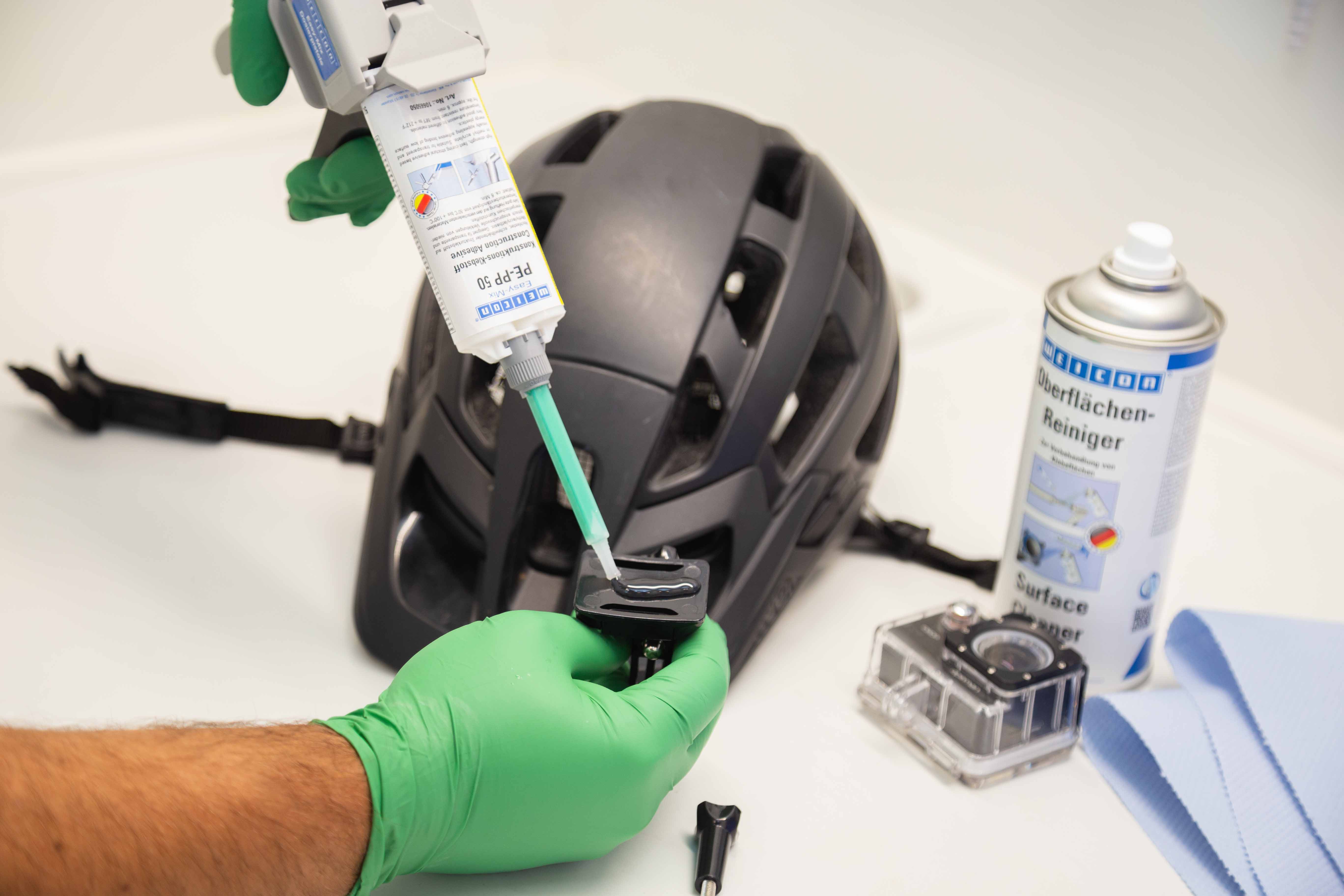Bonding a camera to a bicycle helmet using WEICON Easy-Mix PE-PP 50