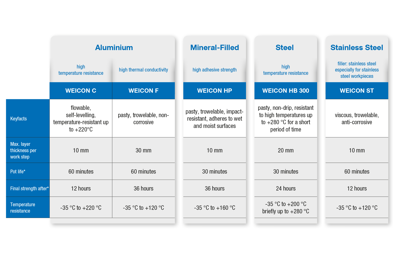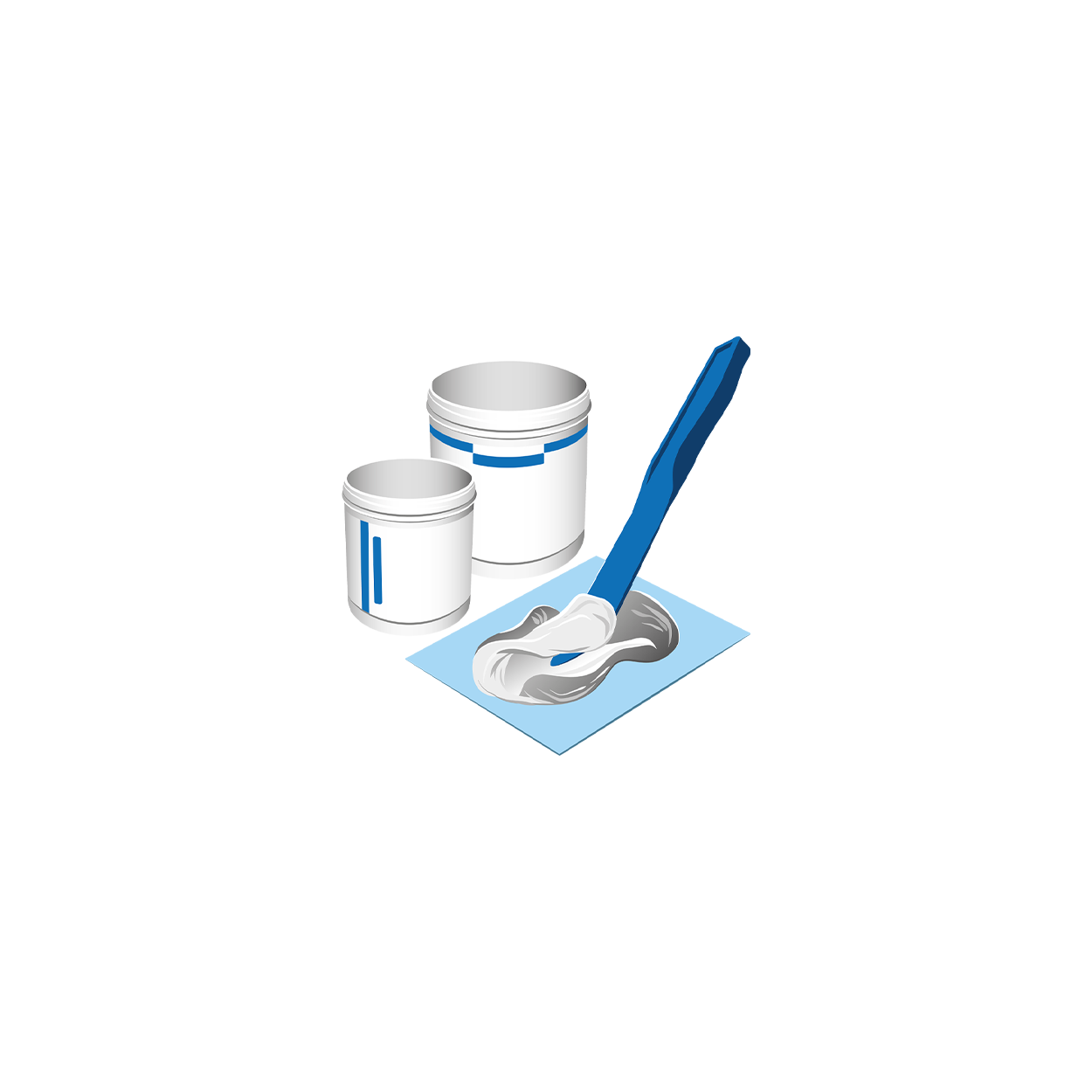 Depending on the type, the epoxy resin system contains a different resin component, such as steel or aluminium powder or mineral fillers. This improves the technical properties of the adhesive. Depending on the filler material, for example, an especially high abrasion resistance, impact resistance, compressive strength as well as temperature resistance can be achieved.