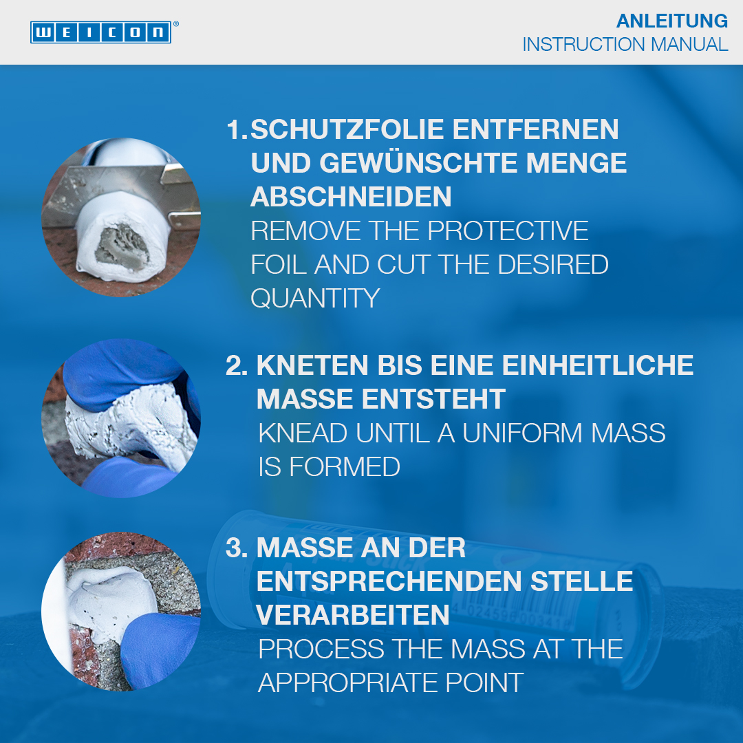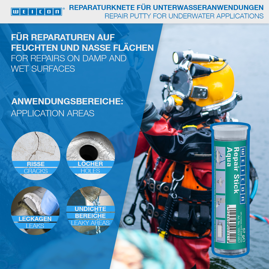 Ideal for quick repairs on damp and wet surfaces and for underwater applications. For the repair and sealing of cracks, holes and leaks in petrol and water tanks, radiators, electrical switchboards, sanitary installations and swimming pools. The WEICON Repair Stick Aqua can be used in sanitary and heating system construction, electrical equipment, the maritime sector and many other industrial applications.