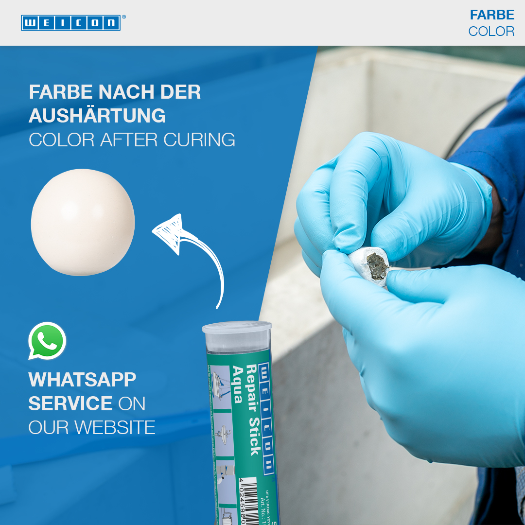 Ideal for quick repairs on damp and wet surfaces and for underwater applications. For the repair and sealing of cracks, holes and leaks in petrol and water tanks, radiators, electrical switchboards, sanitary installations and swimming pools. The WEICON Repair Stick Aqua can be used in sanitary and heating system construction, electrical equipment, the maritime sector and many other industrial applications.