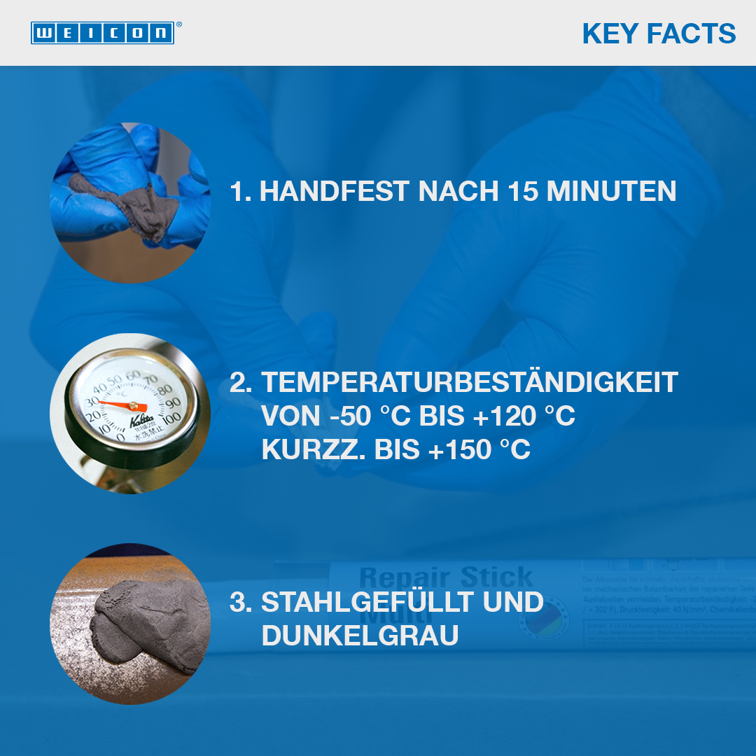 It is especially suitable for the fast and high-strength repair and bonding of metal parts and for patching and sealing cracks, holes and leaks in machine parts, tanks and pipelines, containers, pumps and housings, balcony railings, banisters and torn-out threads. The WEICON Repair Stick Steel can be used in machine and system construction, in tank construction and apparatus engineering, in the food, cosmetics and pharmaceutical industries and in many other applications.