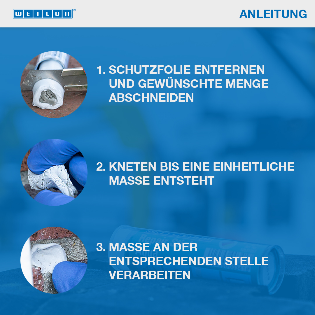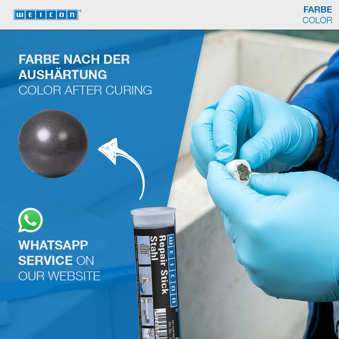 It is especially suitable for the fast and high-strength repair and bonding of metal parts and for patching and sealing cracks, holes and leaks in machine parts, tanks and pipelines, containers, pumps and housings, balcony railings, banisters and torn-out threads. The WEICON Repair Stick Steel can be used in machine and system construction, in tank construction and apparatus engineering, in the food, cosmetics and pharmaceutical industries and in many other applications.