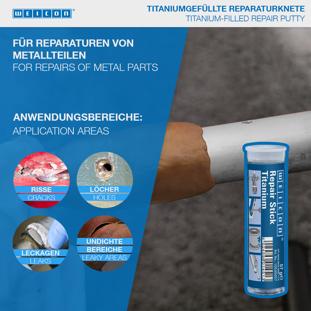It is suited for the permanent and wear-resistant repair and bonding of metal parts such as tanks and pipelines, aluminium, light metal and injection moulded parts, shafts and slide bearings, pumps and housings and torn-out threads. The WEICON Repair Stick Titanium can be used in machine and system construction, tank construction and apparatus engineering, and in many other industrial areas.