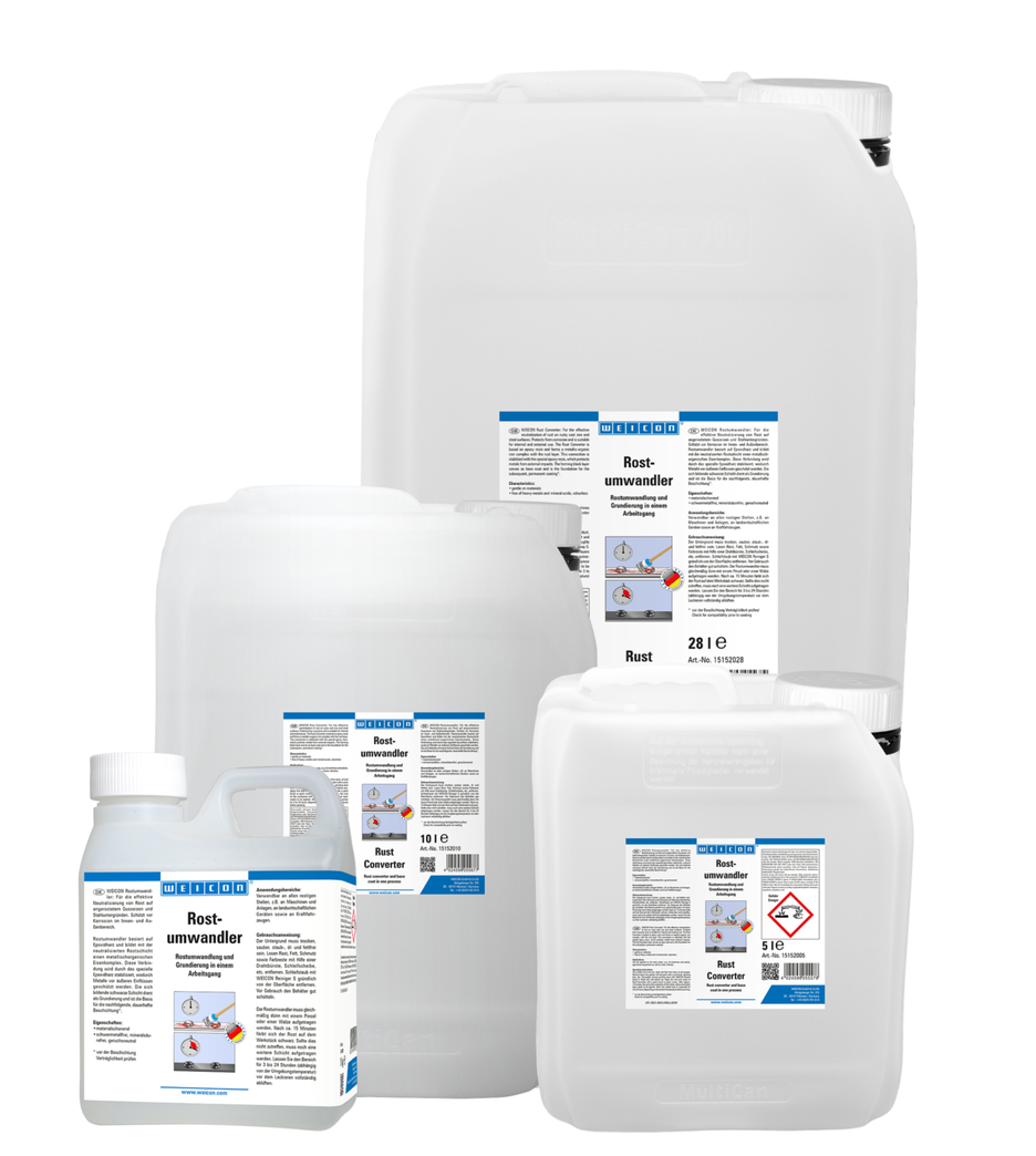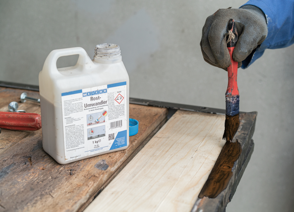 WEICON Rust Converter neutralises rust on corroded iron and steel surfaces and reliably stops corrosion. With its special formula of acid and tannin, the rust converter penetrates the rust. It chemically converts iron oxides into a stable layer and provides temporary corrosion protection through zinc phosphate. Depending on the carbon content of the metal, the treated area changes colour to bluish, brownish or black. The layer provides the perfect base for subsequent protective coatings, e.g. with WEICON Zinc Spray. WEICON Rust Converter achieves optimal results on lightly rusted surfaces with a rust grade of A and B. Loose rust and loose parts should be removed mechanically beforehand. The converter only becomes active when applied to rust or metal and can be used extensively on all rusted areas, such as on machines and equipment, agricultural machinery and motor vehicles. Unlike other converters, WEICON Rust Converter can be washed off the treated surface with clean water and a sponge or soft brush once the reaction time is over. This way, residues that have formed during the conversion process are removed.
