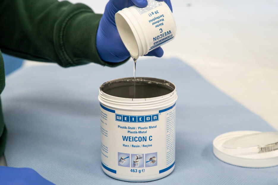 WEICON C is a temperature-resistant and flowable epoxy resin system especially for industrial use. The adhesive is non-corrosive, anti-magnetic and cures practically without shrinkage. WEICON C is particularly suitable as an adhesive for large-scale applications, for pouring out moulds and for the production of fixing devices and tools (e.g. injection moulds). It can be used in the tool and mould making sector as well as in many other industrial areas subjected to high thermal stress.