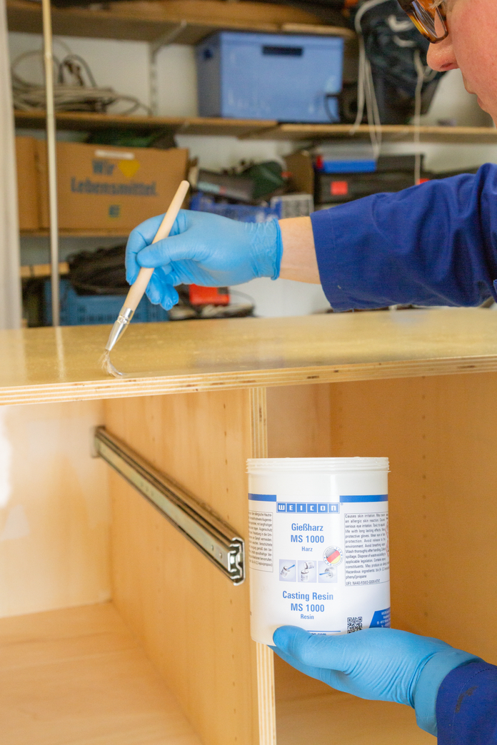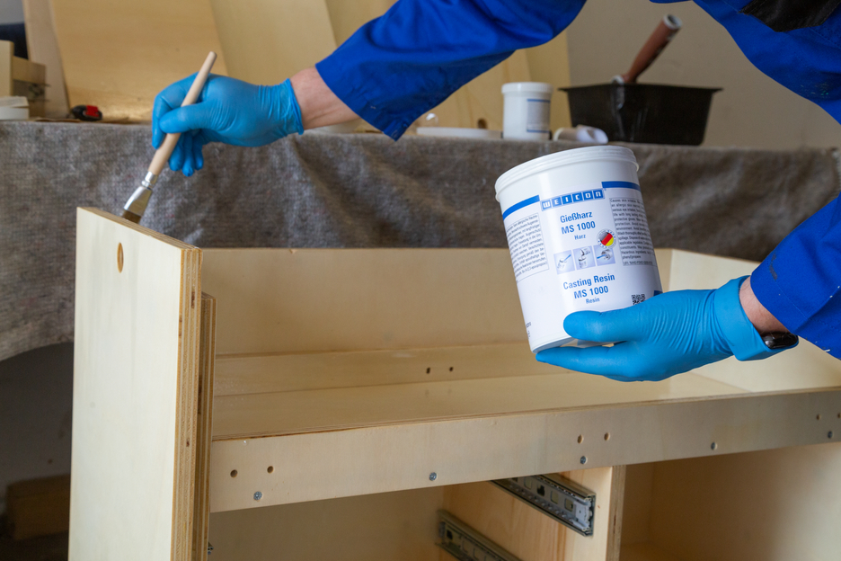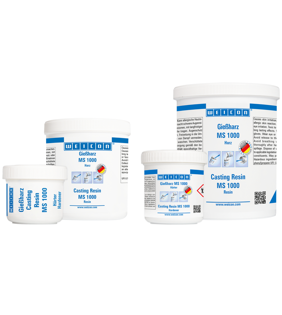 WEICON Casting Resin MS 1000 is a transparent and very flowable epoxy resin system with high mechanical strength. It is suitable for a wide range of applications. MS 1000 adheres well to metal, wood, rigid foam and many plastics. It can be used for large-surface adhesive bonding or for laminating composite threaded bushes and screws. Due to its low viscosity, the epoxy resin system is also suitable for the casting of electric components. It can be used for the production of fibre composites, in tool and mould making, in the electrical industry, in machine construction, and in many other industrial fields. MS 1000 shows good wetting and penetration results of glass fabric and therefore is well-suited for laminating glass, aramid and carbon fibre for the production of fibre-reinforced components. It can also be easily combined with different fillers (powdery, fibrous, fabric).