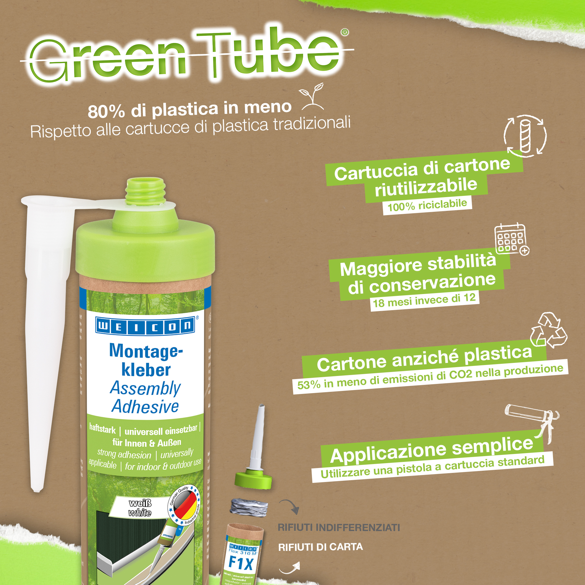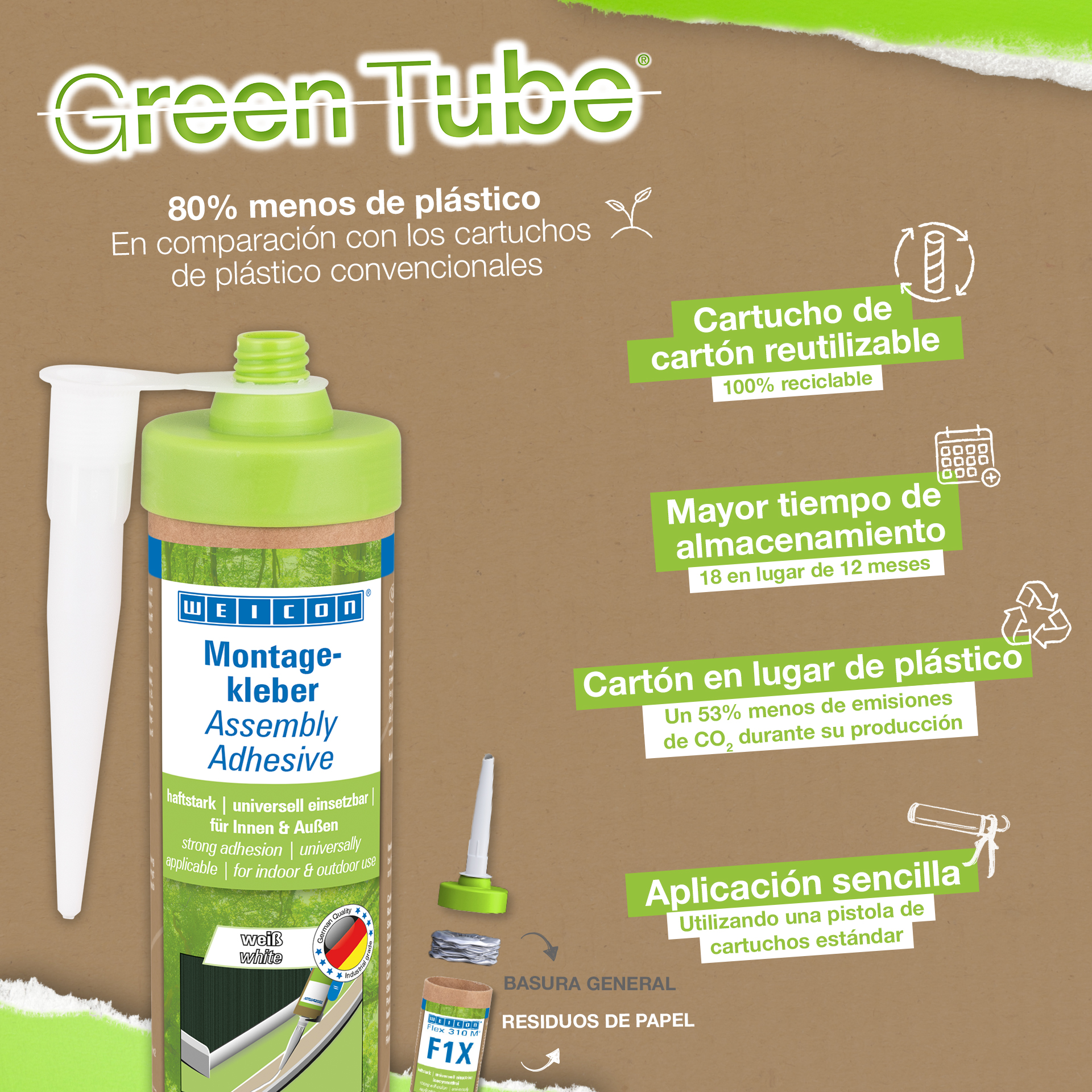 WEICON Assembly Adhesive is a strong dispersion acrylic adhesive for assembly, repair and touch-up work. The adhesive has a high initial adhesion and final strength and cures rapidly. After drying, the Assembly Adhesive can be sanded and plastered over and can be painted over with commercially available paints and varnishes. The adhesive is temperature-resistant in a range from -20°C to +80°C and is suitable for both indoor and outdoor applications. The white flexible adhesive is low-emission and free from solvents. The Assembly Adhesive is universally applicable and can be used for a wide variety of applications. It is ideal, for example, for surface bonding of wood-based materials (such as skirting boards, decorative mouldings, panels or chipboard), PVC, polystyrene, polystyrene foam boards, PU rigid foam (e.g. insulation boards and cable ducts), mineral materials (e.g. tiles) and metals on absorbent substrates such as plaster, concrete, fibre cement, plasterboard and untreated wood. Eco-friendly packaging – same strong performance! Green Tube, the sustainable packaging: the tip and lid are made from 100% recycled plastic, and the cartridge body is made entirely of cardboard. This means lower CO₂ emissions and reduced plastic use compared to conventional cartridges – all without compromising on performance!