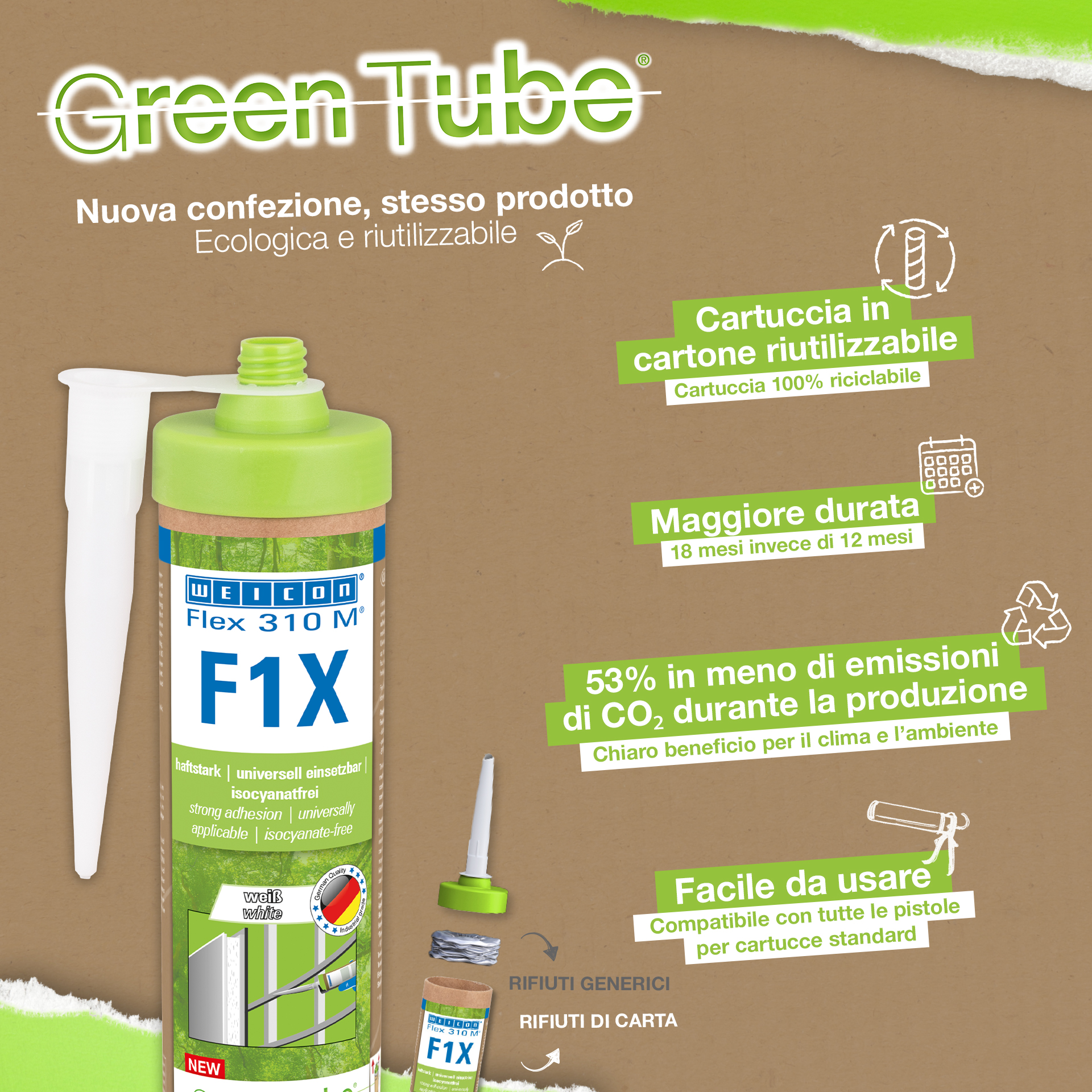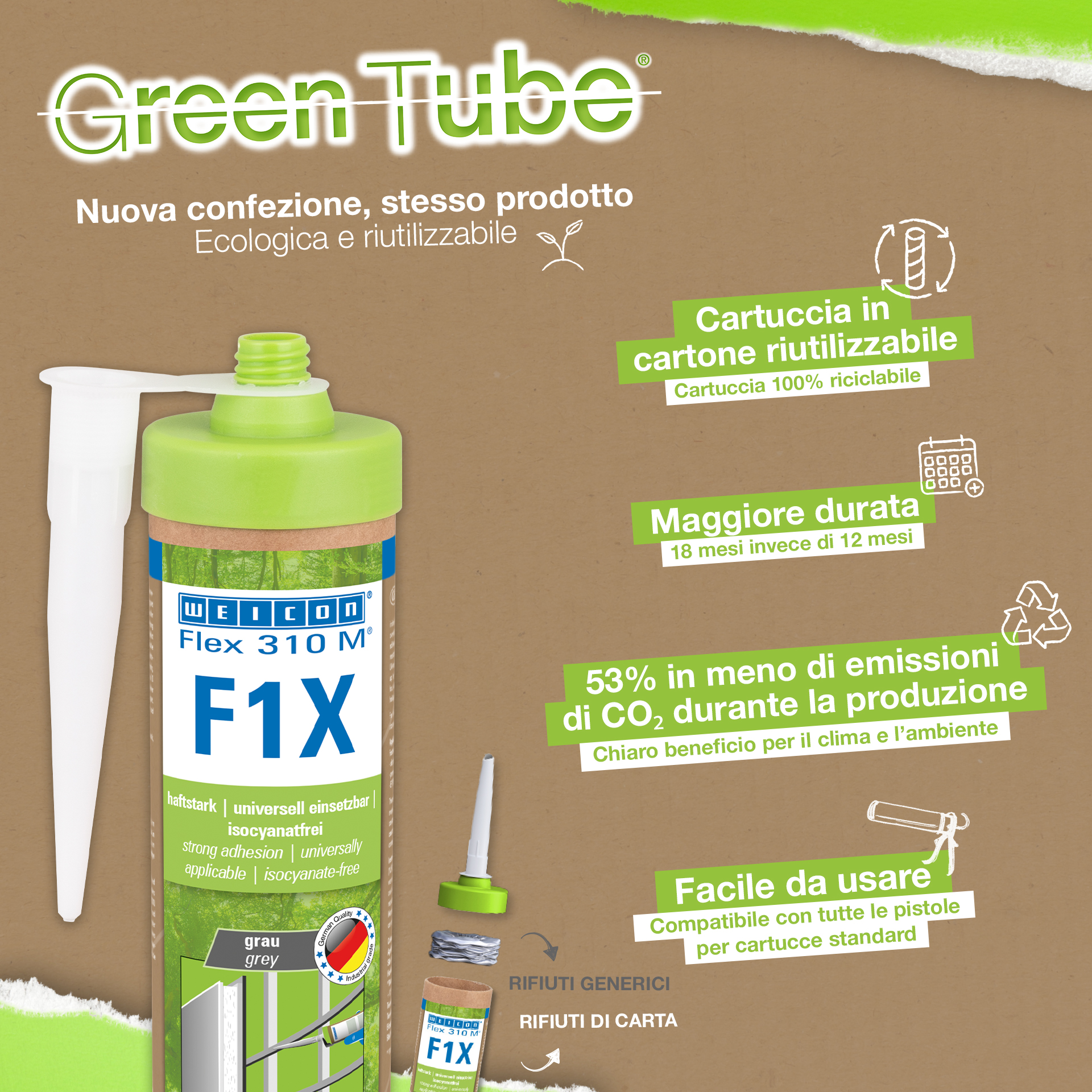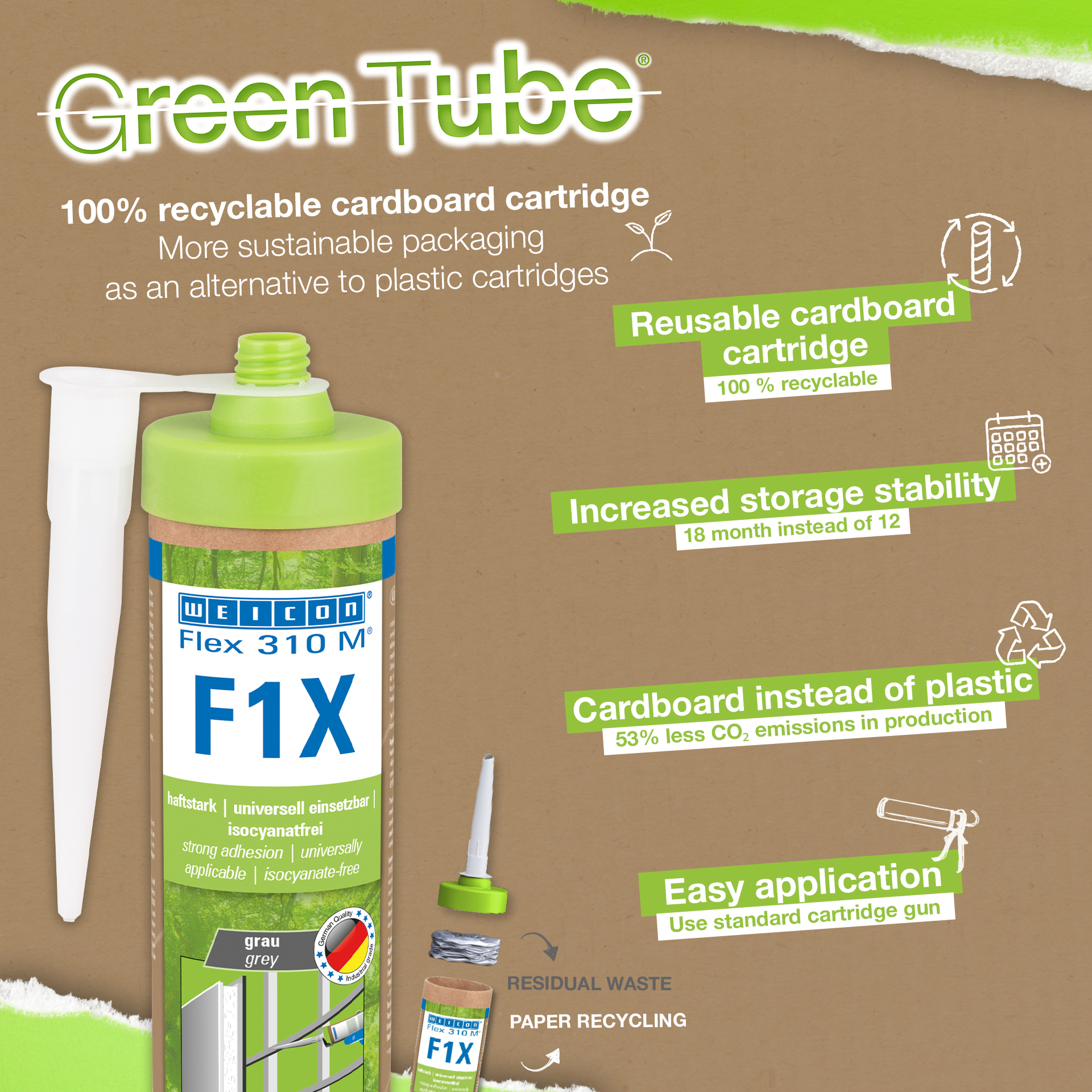 WEICON Flex 310 M F1X is an elastic adhesive and sealant based on MS polymer. The grey adhesive is very strong and universally suitable for permanently fixing almost all materials to a variety of surfaces. Thanks to the very high initial adhesion, bonding is possible on vertical surfaces and even overhead, both indoors and outdoors. For example, Flex 310 M F1X can be used to bond metals, many plastics, ceramics, wood, glass and stone to each other. The permanently elastic adhesive can be painted over “wet on wet”, is sandable, weather-resistant, moisture-resistant, ageing-resistant, mould-resistant and UV-resistant. It is briefly (up to 30 minutes) resistant to temperatures up to 180°C and can be powder-coated after a curing time of four days. The adhesive and sealant is free of silicone, isocyanates, halogens and solvents and is non-corrosive. Flex 310 M F1X can be used for fixing skirting boards, acoustic panels, strips, frames, panels, boards, tiles, stones and EPDM foil. It can be used in drywall and interior construction, metal construction, tank and apparatus construction, container construction, ventilation and air conditioning technology, trade fair and shop construction, yacht and boat building and wherever silicones or products containing silicone are not suitable. Eco-friendly packaging – same strong performance! Green Tube, the sustainable packaging: the tip and lid are made from 100% recycled plastic, and the cartridge body is made entirely of cardboard. This means lower CO₂ emissions and reduced plastic use compared to conventional cartridges – all without compromising on performance!