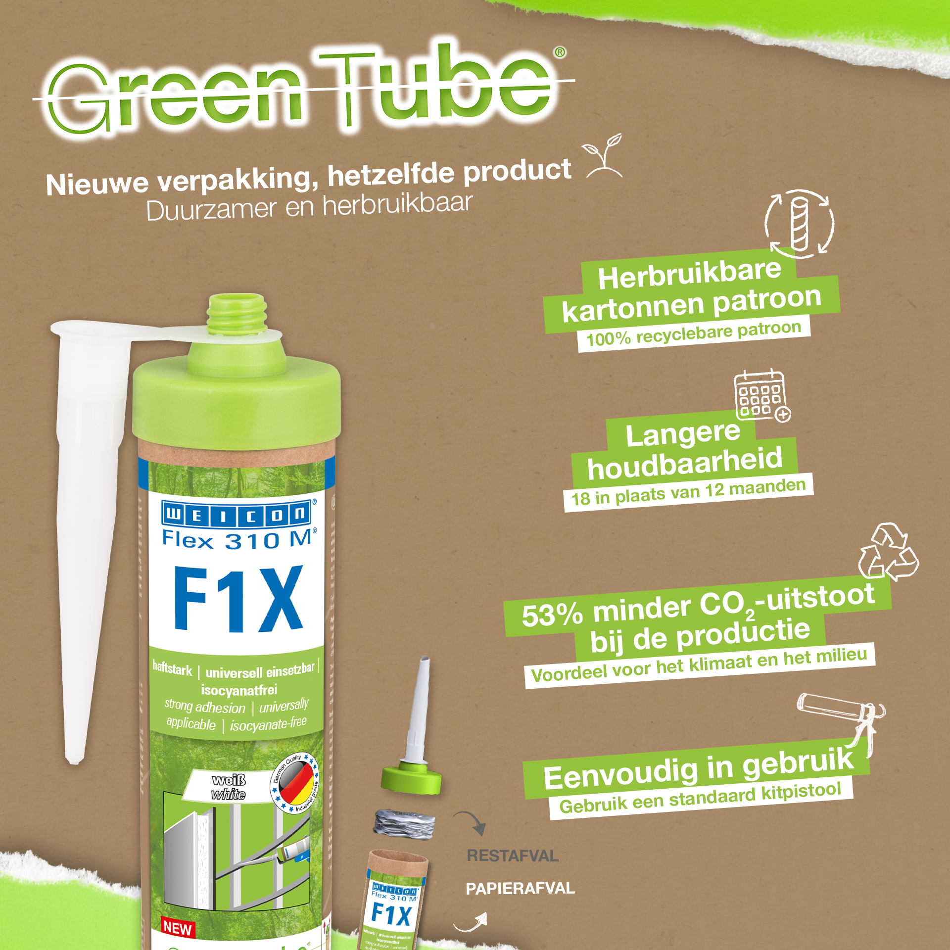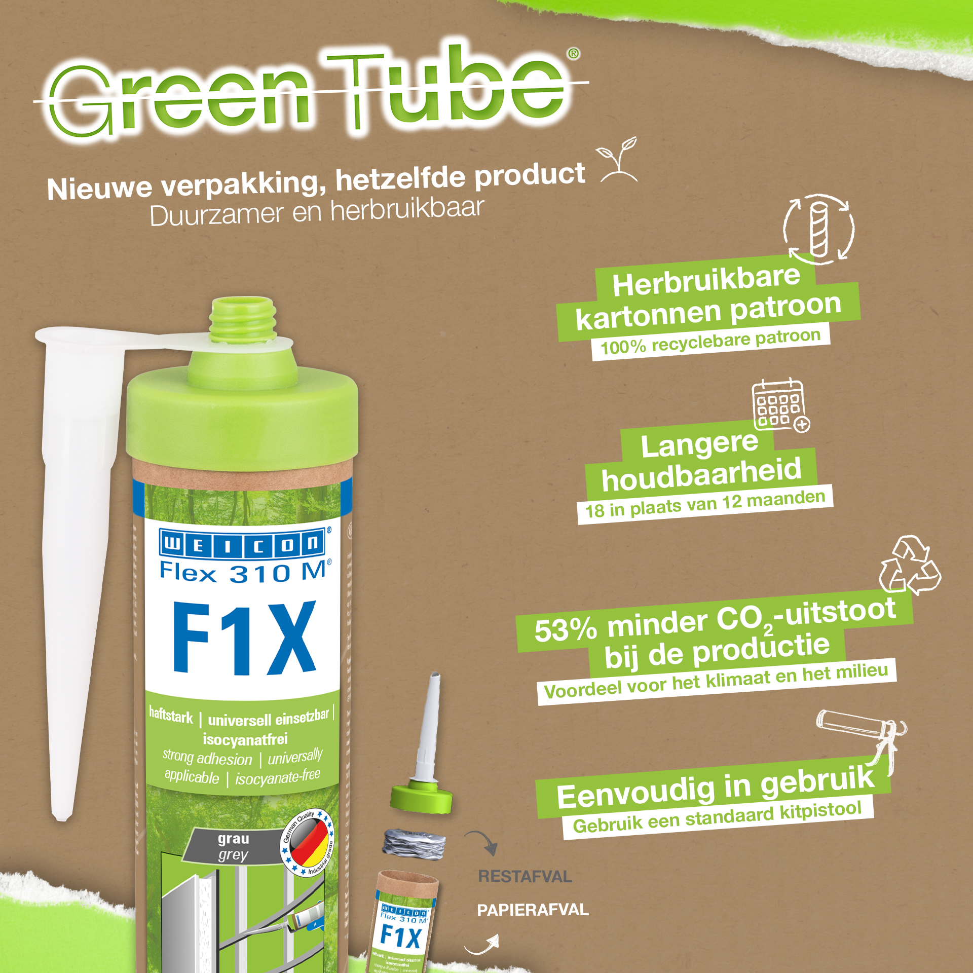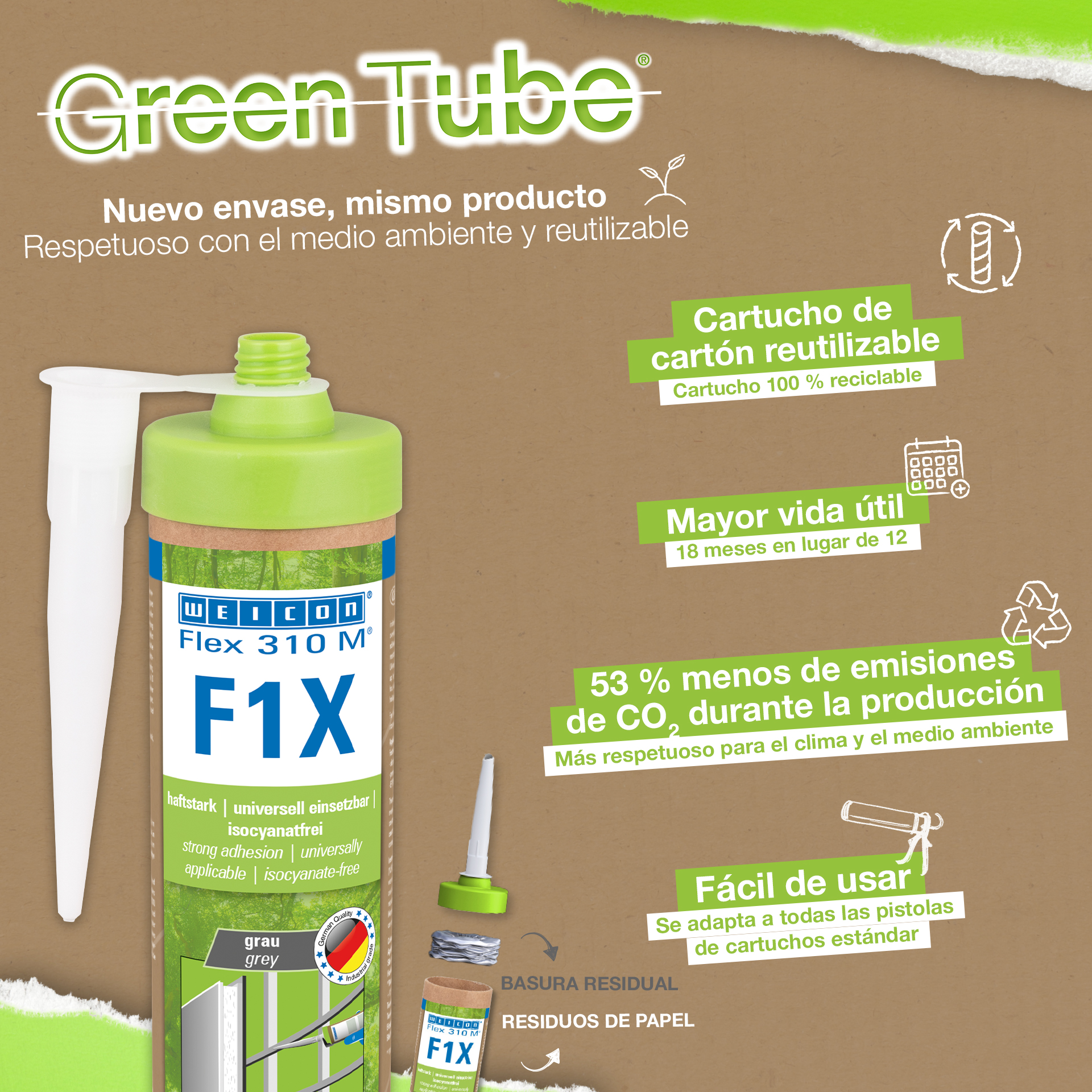 WEICON Flex 310 M F1X is an elastic adhesive and sealant based on MS polymer. The grey adhesive is very strong and universally suitable for permanently fixing almost all materials to a variety of surfaces. Thanks to the very high initial adhesion, bonding is possible on vertical surfaces and even overhead, both indoors and outdoors. For example, Flex 310 M F1X can be used to bond metals, many plastics, ceramics, wood, glass and stone to each other. The permanently elastic adhesive can be painted over “wet on wet”, is sandable, weather-resistant, moisture-resistant, ageing-resistant, mould-resistant and UV-resistant. It is briefly (up to 30 minutes) resistant to temperatures up to 180°C and can be powder-coated after a curing time of four days. The adhesive and sealant is free of silicone, isocyanates, halogens and solvents and is non-corrosive. Flex 310 M F1X can be used for fixing skirting boards, acoustic panels, strips, frames, panels, boards, tiles, stones and EPDM foil. It can be used in drywall and interior construction, metal construction, tank and apparatus construction, container construction, ventilation and air conditioning technology, trade fair and shop construction, yacht and boat building and wherever silicones or products containing silicone are not suitable. Eco-friendly packaging – same strong performance! Green Tube, the sustainable packaging: the tip and lid are made from 100% recycled plastic, and the cartridge body is made entirely of cardboard. This means lower CO₂ emissions and reduced plastic use compared to conventional cartridges – all without compromising on performance!