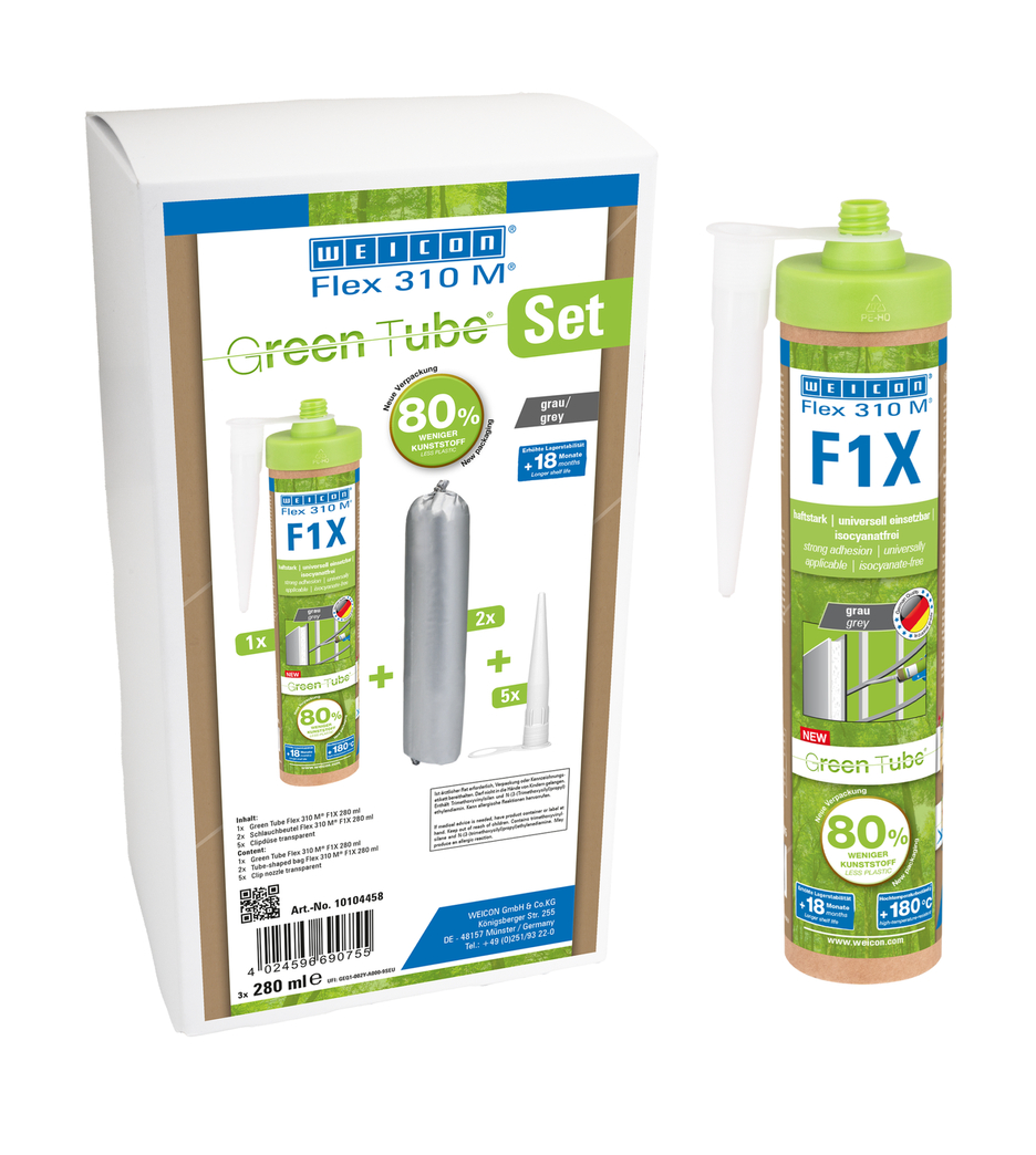 WEICON Flex 310 M F1X is an elastic adhesive and sealant based on MS polymer. The grey adhesive is very strong and universally suitable for permanently fixing almost all materials to a variety of surfaces. Thanks to the very high initial adhesion, bonding is possible on vertical surfaces and even overhead, both indoors and outdoors. For example, Flex 310 M F1X can be used to bond metals, many plastics, ceramics, wood, glass and stone to each other. The permanently elastic adhesive can be painted over “wet on wet”, is sandable, weather-resistant, moisture-resistant, ageing-resistant, mould-resistant and UV-resistant. It is briefly (up to 30 minutes) resistant to temperatures up to 180°C and can be powder-coated after a curing time of four days. The adhesive and sealant is free of silicone, isocyanates, halogens and solvents and is non-corrosive. Flex 310 M F1X can be used for fixing skirting boards, acoustic panels, strips, frames, panels, boards, tiles, stones and EPDM foil. It can be used in drywall and interior construction, metal construction, tank and apparatus construction, container construction, ventilation and air conditioning technology, trade fair and shop construction, yacht and boat building and wherever silicones or products containing silicone are not suitable. Eco-friendly packaging – same strong performance! Green Tube, the sustainable packaging: the tip and lid are made from 100% recycled plastic, and the cartridge body is made entirely of cardboard. This means lower CO₂ emissions and reduced plastic use compared to conventional cartridges – all without compromising on performance!