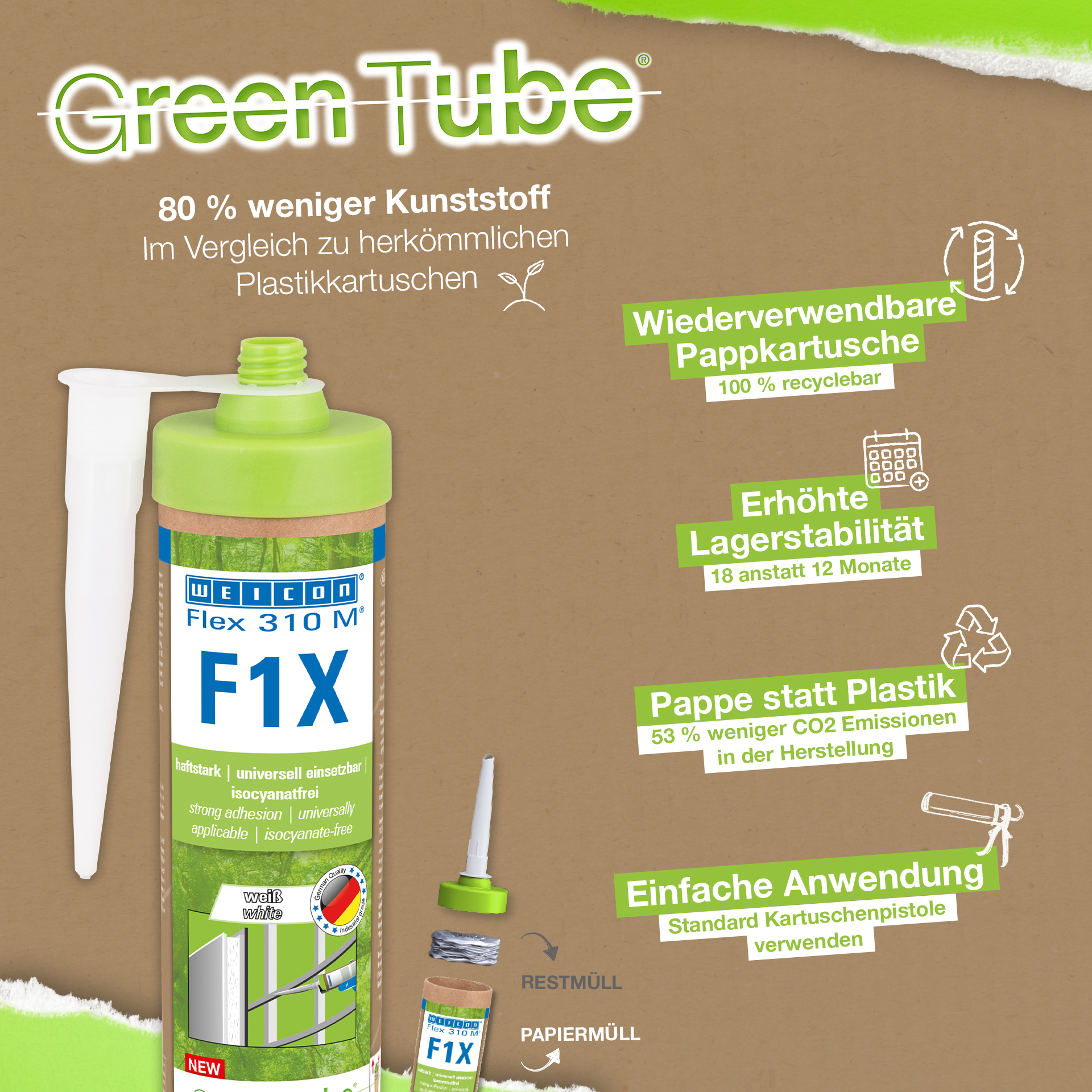 WEICON Flex 310 M F1X is an elastic adhesive and sealant based on MS polymer. The grey adhesive is very strong and universally suitable for permanently fixing almost all materials to a variety of surfaces. Thanks to the very high initial adhesion, bonding is possible on vertical surfaces and even overhead, both indoors and outdoors. For example, Flex 310 M F1X can be used to bond metals, many plastics, ceramics, wood, glass and stone to each other. The permanently elastic adhesive can be painted over “wet on wet”, is sandable, weather-resistant, moisture-resistant, ageing-resistant, mould-resistant and UV-resistant. It is briefly (up to 30 minutes) resistant to temperatures up to 180°C and can be powder-coated after a curing time of four days. The adhesive and sealant is free of silicone, isocyanates, halogens and solvents and is non-corrosive. Flex 310 M F1X can be used for fixing skirting boards, acoustic panels, strips, frames, panels, boards, tiles, stones and EPDM foil. It can be used in drywall and interior construction, metal construction, tank and apparatus construction, container construction, ventilation and air conditioning technology, trade fair and shop construction, yacht and boat building and wherever silicones or products containing silicone are not suitable. Eco-friendly packaging – same strong performance! Green Tube, the sustainable packaging: the tip and lid are made from 100% recycled plastic, and the cartridge body is made entirely of cardboard. This means lower CO₂ emissions and reduced plastic use compared to conventional cartridges – all without compromising on performance!