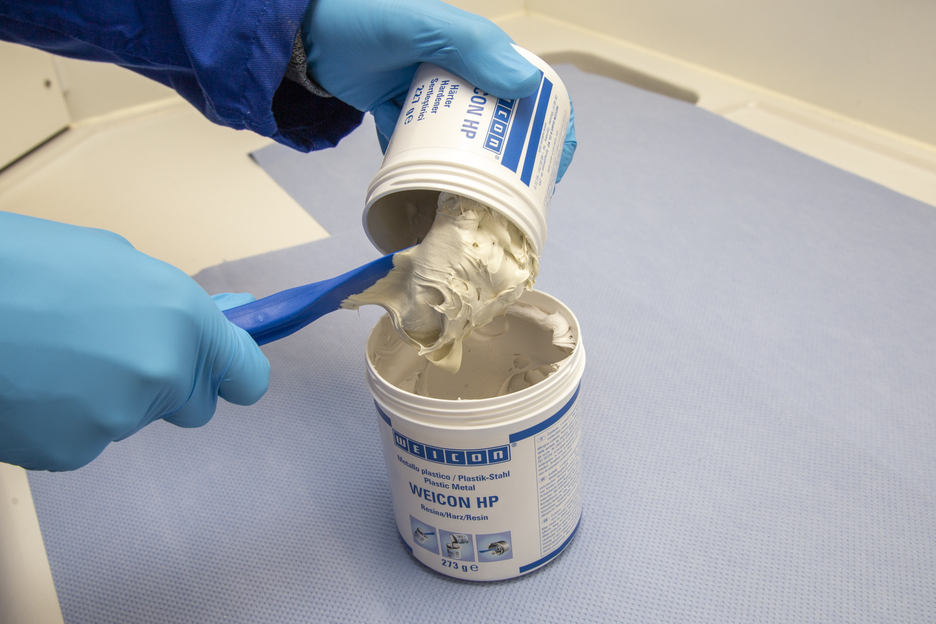 WEICON HP is a 2-component epoxy resin with longer curing time, enormous impact strength as well as high residual elasticity and abrasion resistance. Due to its high elongation at break and paste-like texture, WEICON HP can be used for repairs, as abrasion protection as well as for lining heavily stressed equipment. The adhesive also shows excellent adhesion to wet and damp surfaces and in underwater applications.