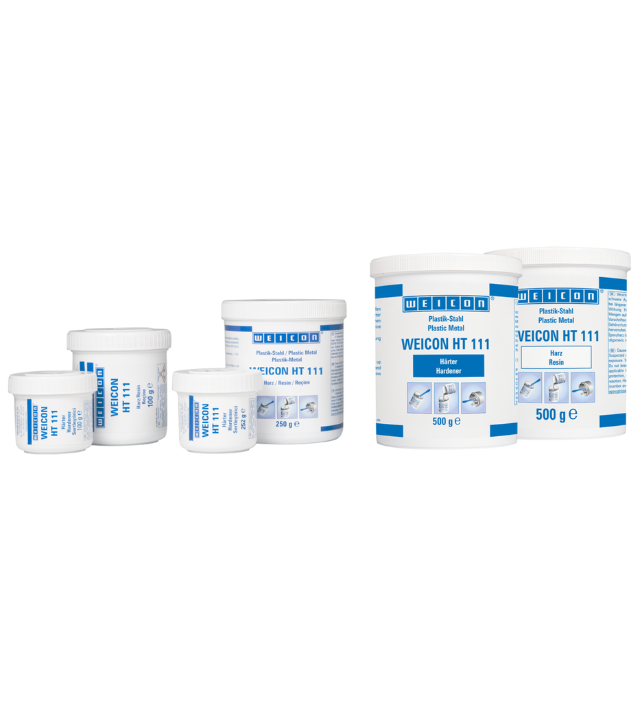 The Epoxy Resin System WEICON HT 111 is used for repairing and reconditioning metal parts. It is pasty, steel-filled and high-temperature resistant up to 200 °C (392 °F) and withstands temperatures up to 280 °C (536 °F) for short periods. WEICON HT 111 is chemical-resistant, does not corrode and is applied in a mixing ratio of 1:1. The repair material is also suitable for treatment on vertical surfaces and can be used for metal repair and bonding of cast and metal parts, for filling of blow holes, for repairing damage on containers, carriages and machine parts and for sealing pumps and pipes. Due to its properties, the composite material is particularly suitable for applications in mechanical and plant construction, apparatus construction and many other areas of industry.