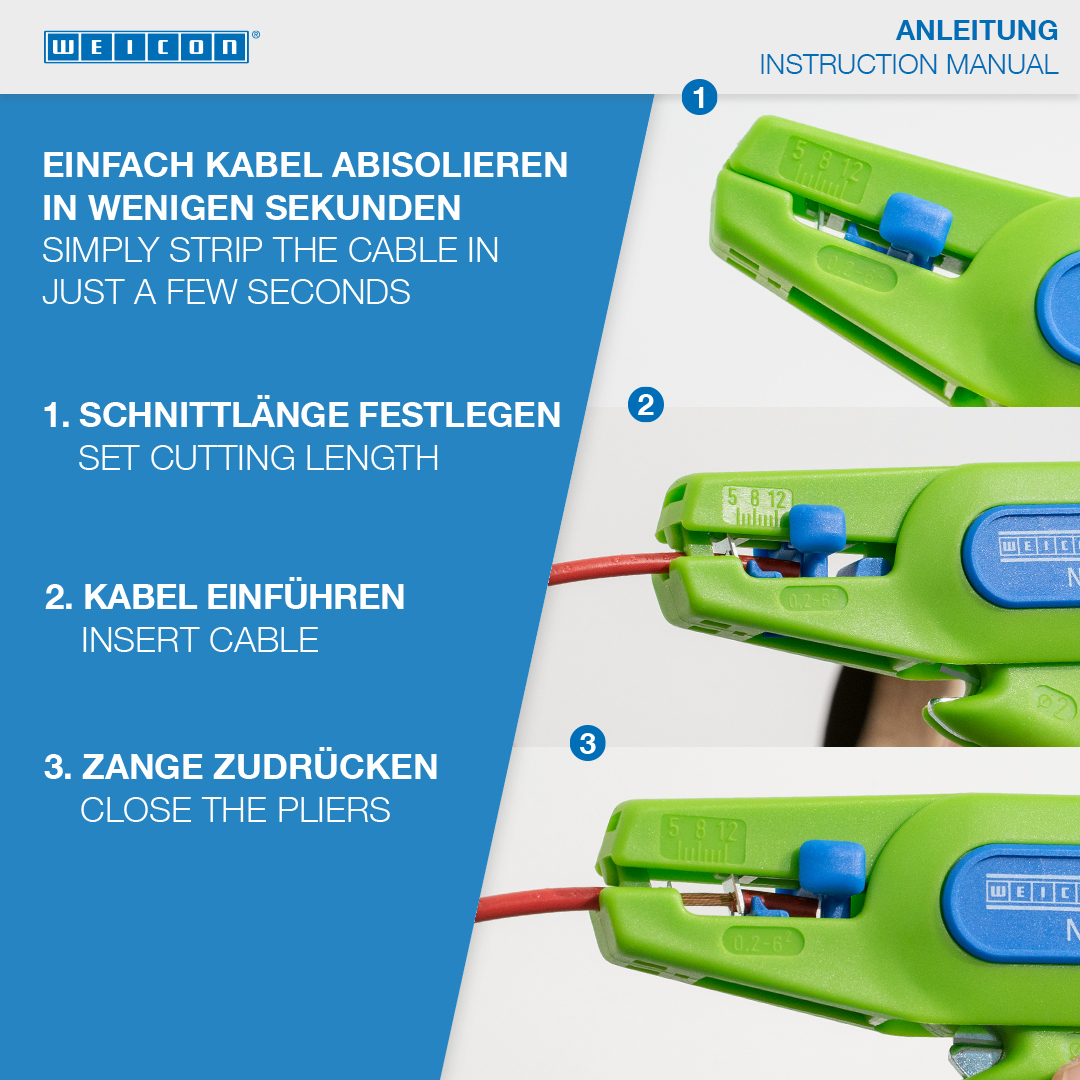 The WEICON TOOLS Green Line is a unique product range specifically designed with sustainability and resource conservation in mind. The Green Line features stripping tools made with up to 97 % renewable and natural materials The WEICON Wire Stripper No. 5 Green Line is suitable for stripping all stranded and solid conductors from 0.2 - 6.0 mm². The wire stripper also has a visual length scale from 5 - 12mm. The length stop can be removed, if required. A well-accessible side cutter is integrated in the tool, which is suitable for cable diameters up to 2 mm. The blades are replaceable. The low weight of the No. 5 ensures fatigue-free working.