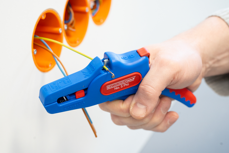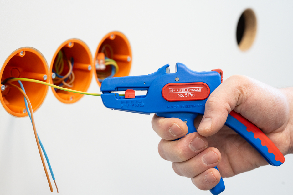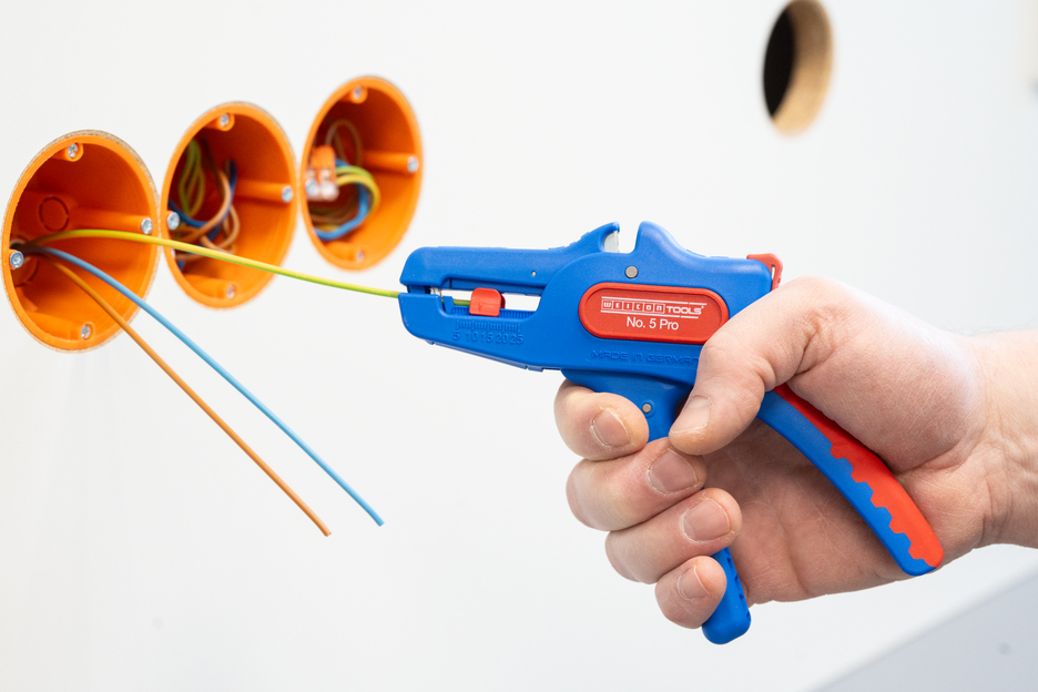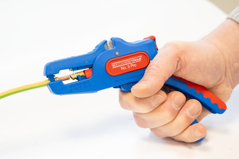 The automatic wire stripper can be used for stripping all common stranded and solid conductors from 0.2 to 16 mm². An adjustable length stop from 5 to 25 mm enables very precise and accurate working. The length stop can be removed, if required. The wire stripper automatically to adjusts to the required conductor cross-section – so no manual adjustment is necessary. The stripping tool features an integrated side cutter, which is suitable for conductors made of copper and aluminium up to a diameter of three millimetres. Thanks to slim design of the tool, the stripper can also be used in working areas that are difficult to access, such as in switch cabinets. The mechanics of the stripping tool are very smooth-running and have proven to be durable and reliable in numerous tests. The wire stripper has a non-slip multi-component handle in the blue-red "Ice Crack" design. The wire stripper has an eyelet to attach a strap for fall protection and is equipped with a labelling surface to be able to individualise the tool. In addition, the tool has a locking mechanism for space-saving storage.